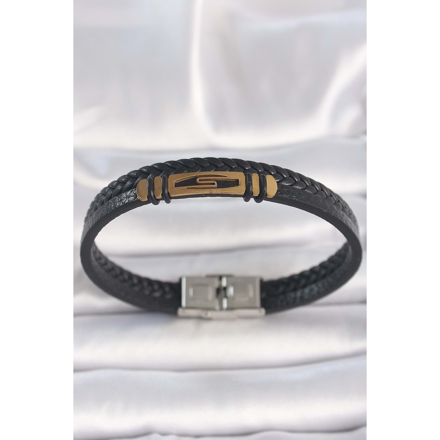 316L Çelik Gold Renk Aksesuarlı Çift Sıra Siyah Burgu Desenli Deri Kordon Erkek Bileklik