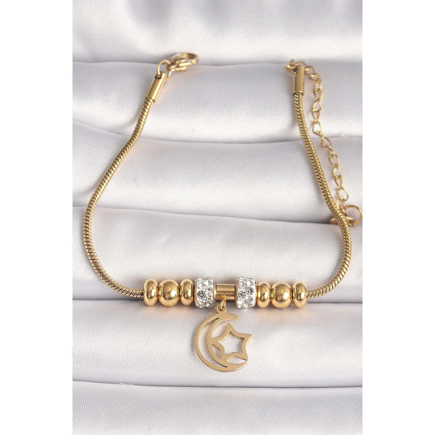 316L Çelik Gold Renk Tüp Zincir Zirkon Taş Detaylı Sallantı Ay Yıldız Figür Kadın Bileklik