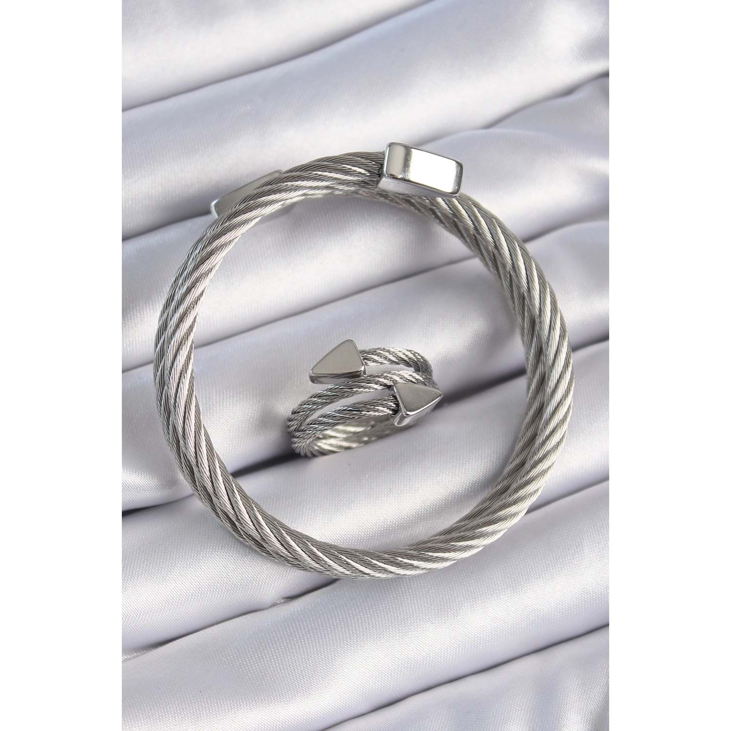 316L Çelik Gümüş Renk Sarmal Model Erkek Bileklik Yüzük Kombini