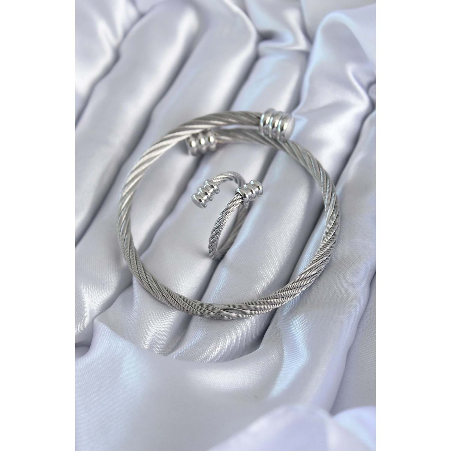 316L Çelik Gümüş Renk Sarmal Model Erkek Bileklik Yüzük Kombini