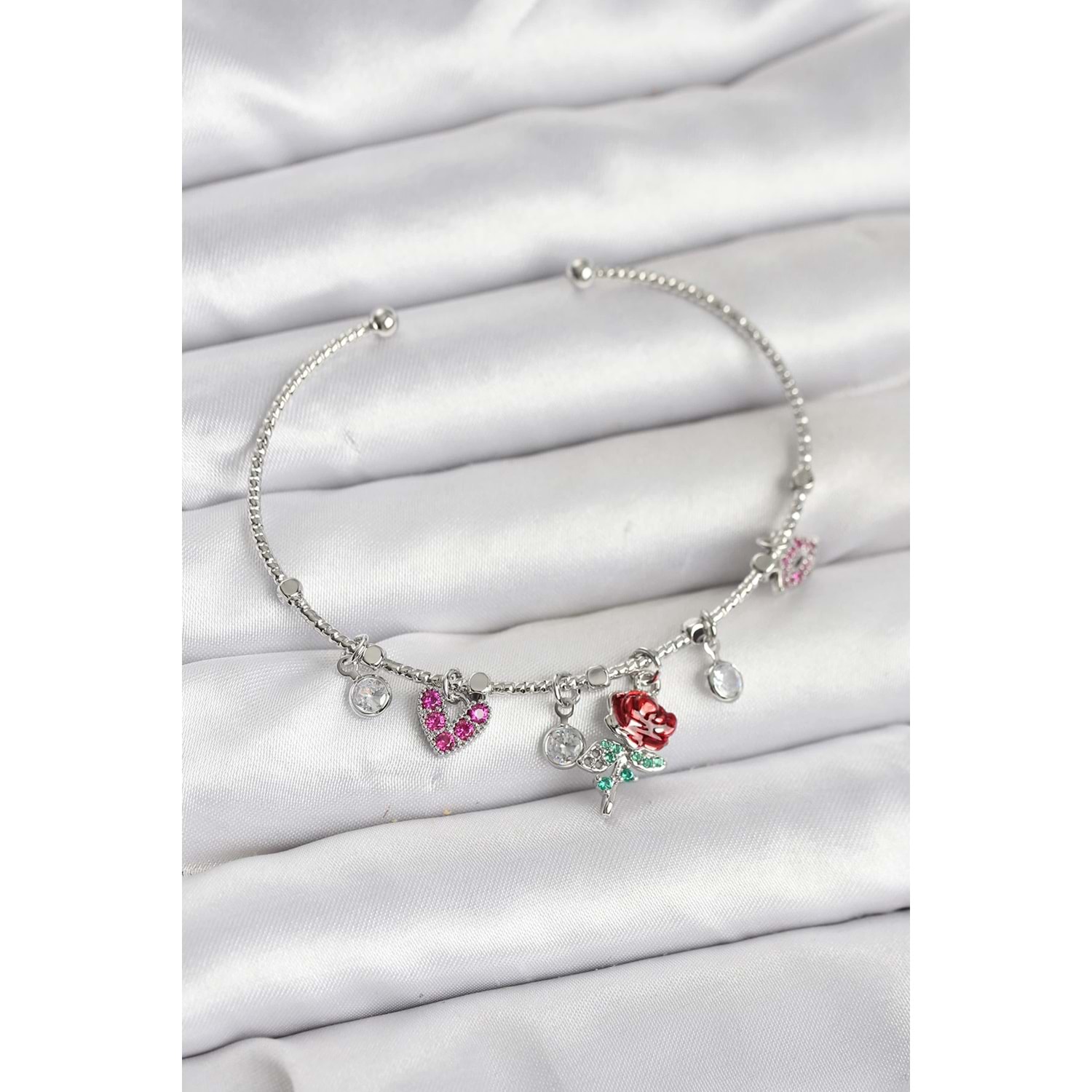 Gül Charmlı Gümüş Renk Pirinç Kadın Bileklik