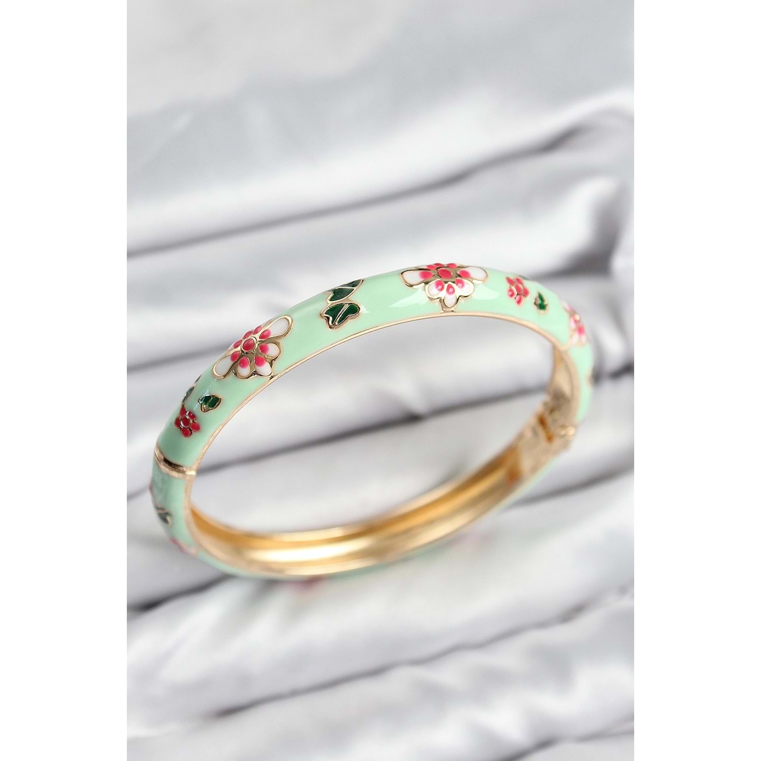 Mineli Pirinç Su Yeşili Çiçek Motifli Gold Kadın Kelepçe