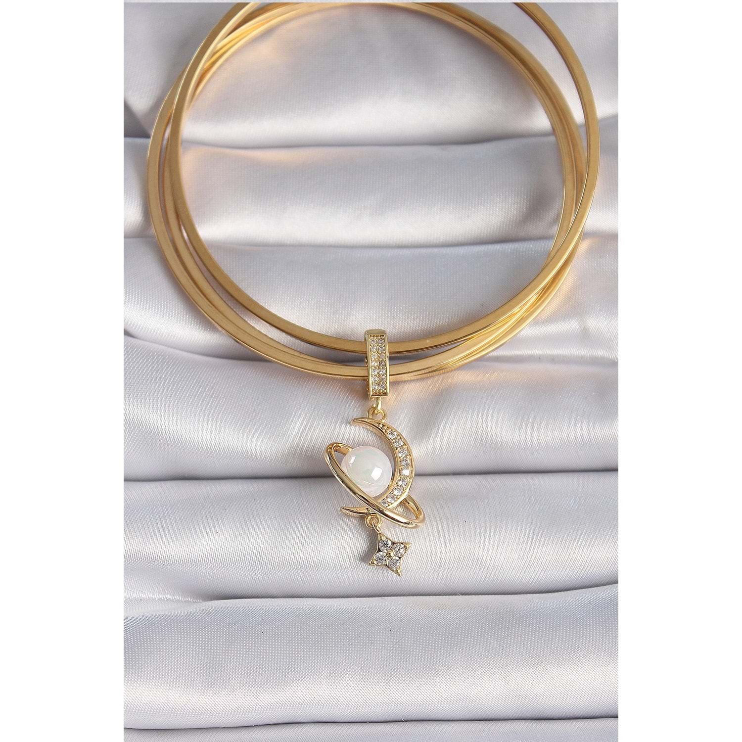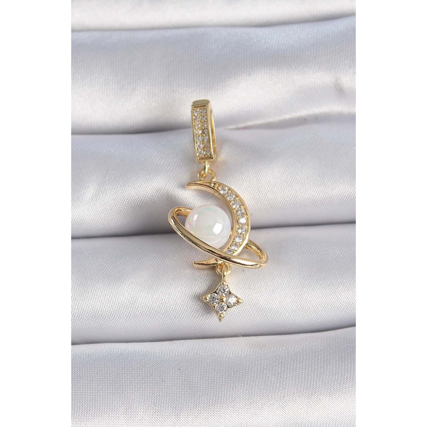 Pirinç Gold Renk Zirkon Taş Detaylı Hilal Model Sallantı İncili Ajda Charm