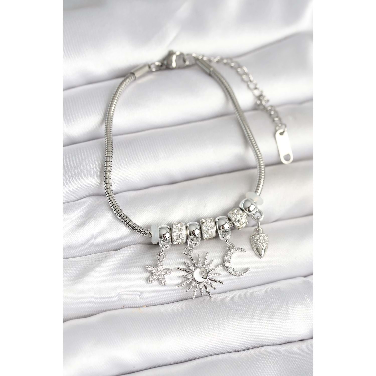 Pirinç Gümüş Renk Ay ve Güneş Charmlı Kadın Bileklik