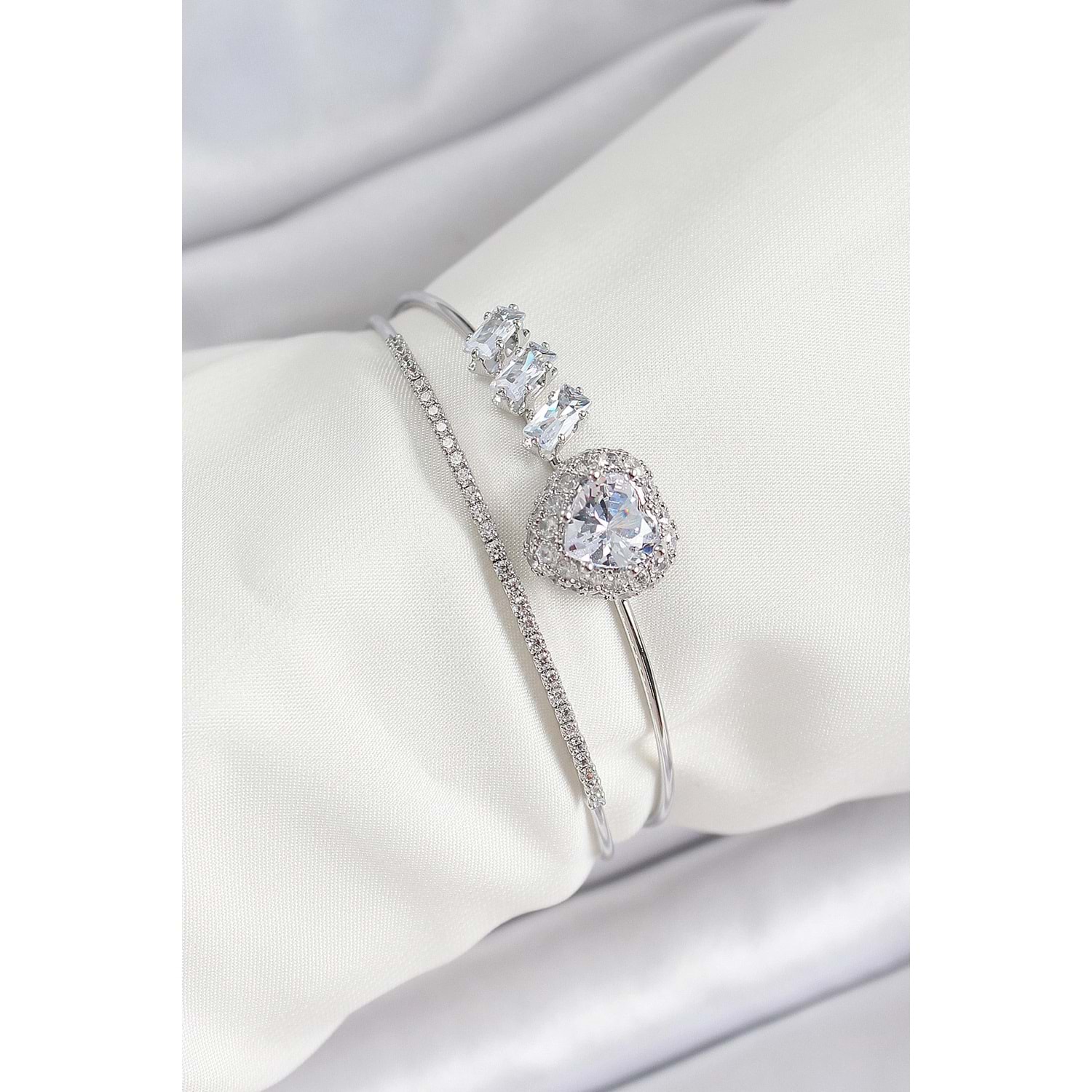 Pirinç Gümüş Renk Kalpli Zirkon Taşlı Kadın Bileklik