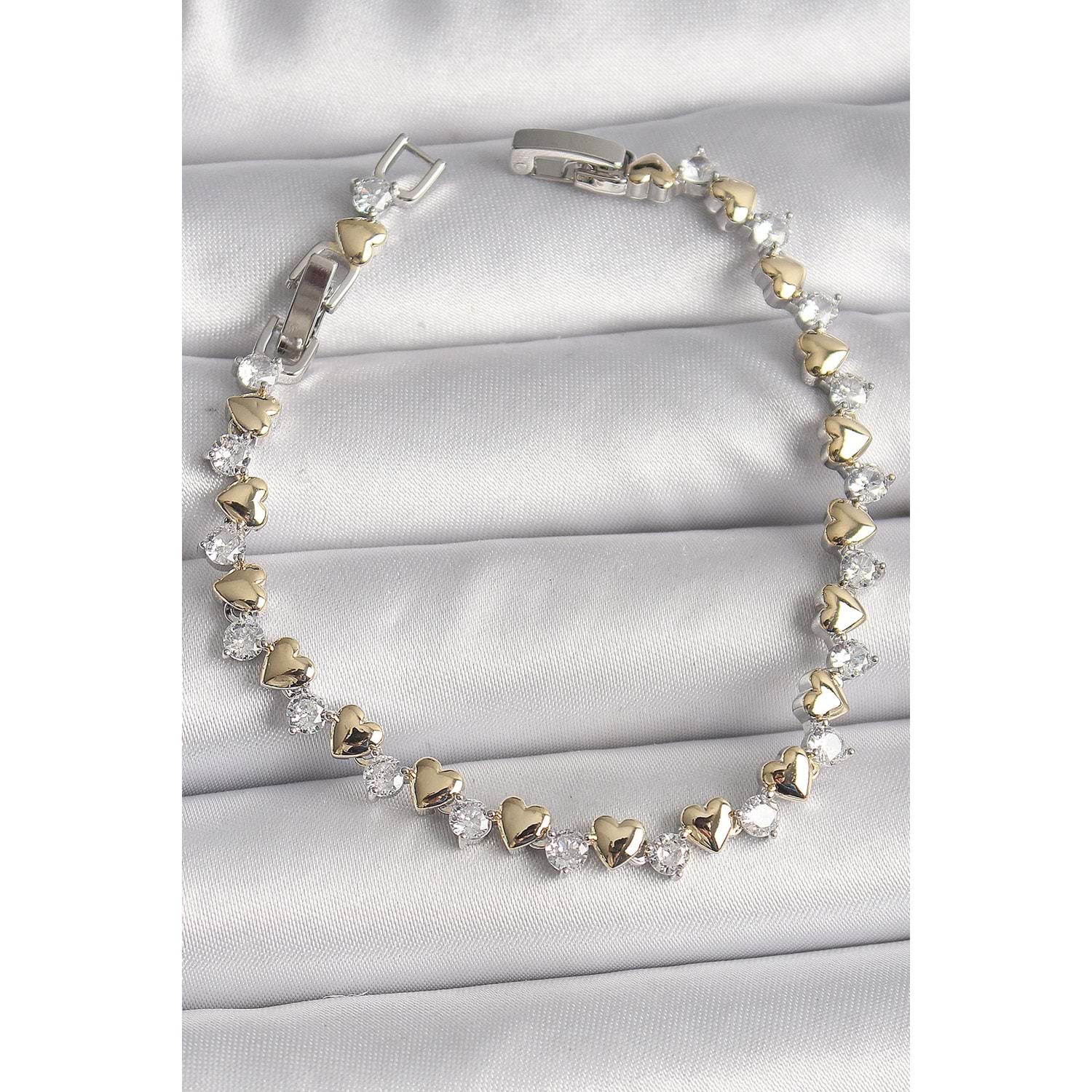 Pirinç Gümüş Renk Zirkon Taşlı Gold Kalpli VIP Seri Kadın Bileklik