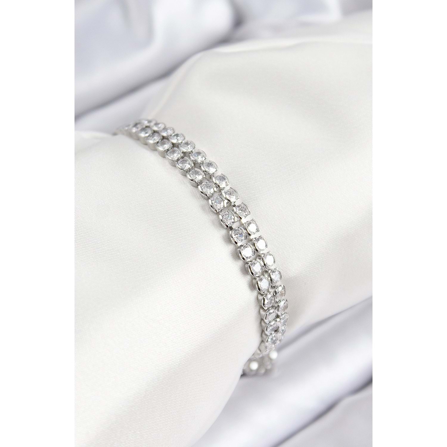 Pirinç Zirkon Taşlı Çift Sıra Model Gümüş Renk Asansörlü Kadın Bileklik