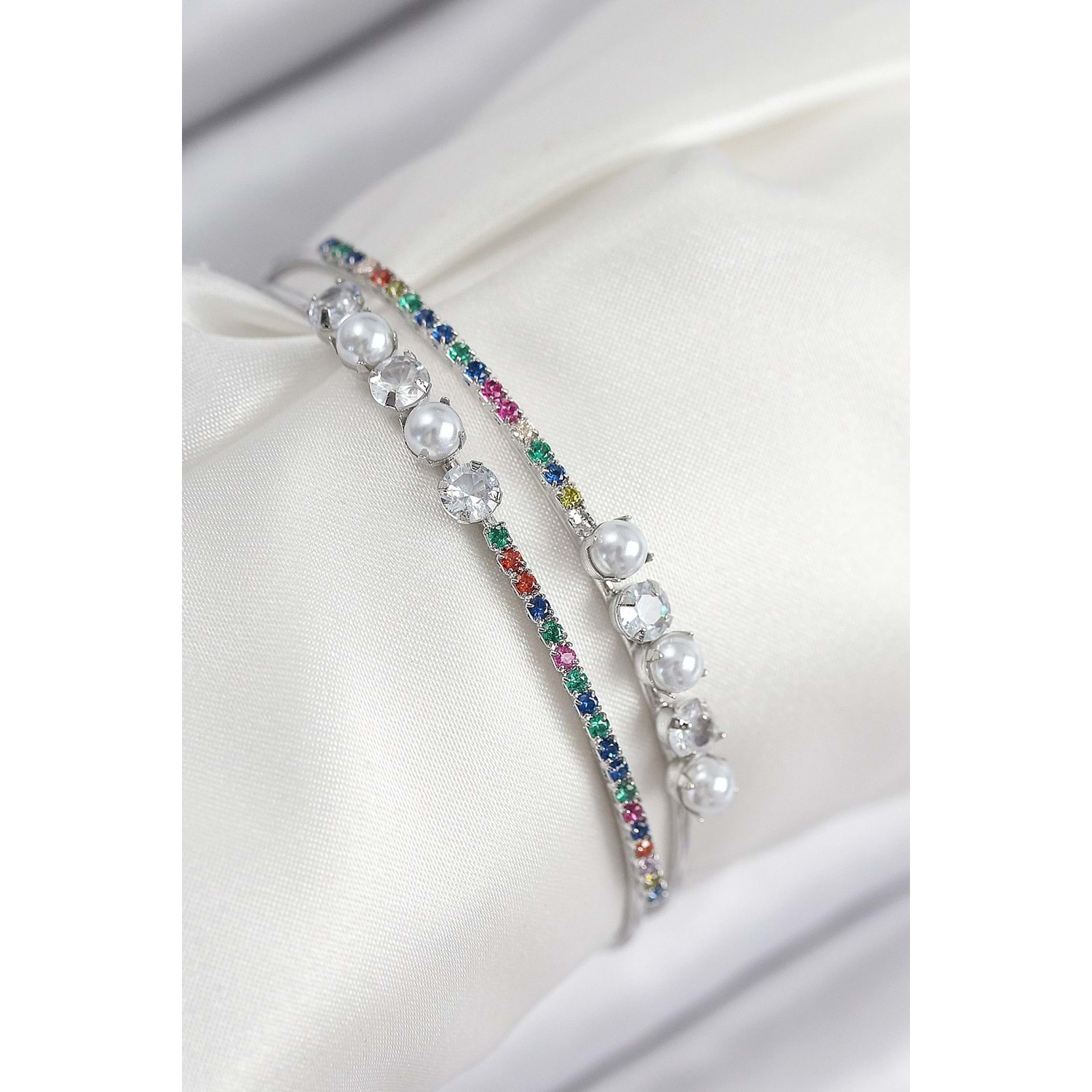 Pirinç Zirkon Taşlı İnci Model Gümüş Renk Kadın Bileklik