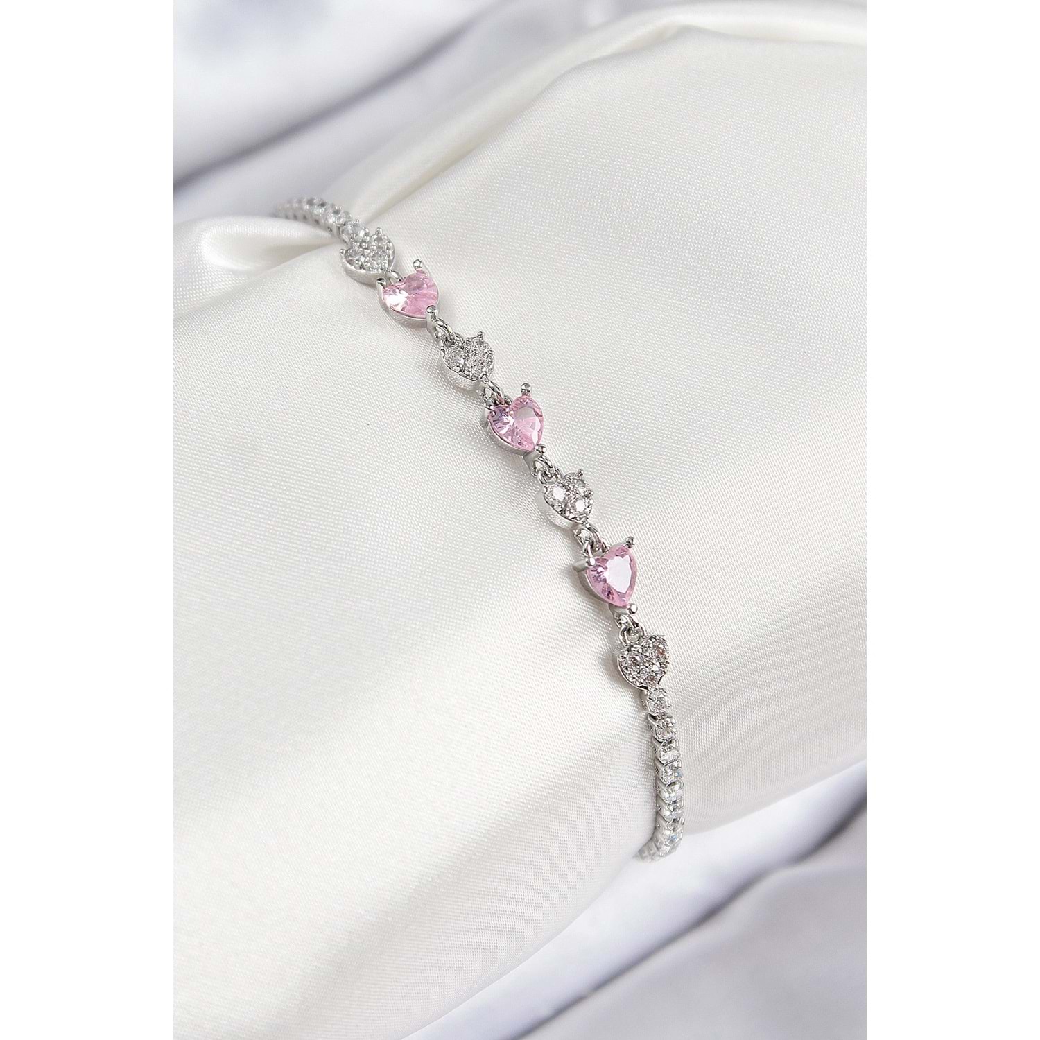 Pirinç Zirkon Taşlı Pembe Kalp Model Gümüş Renk Kadın Bileklik