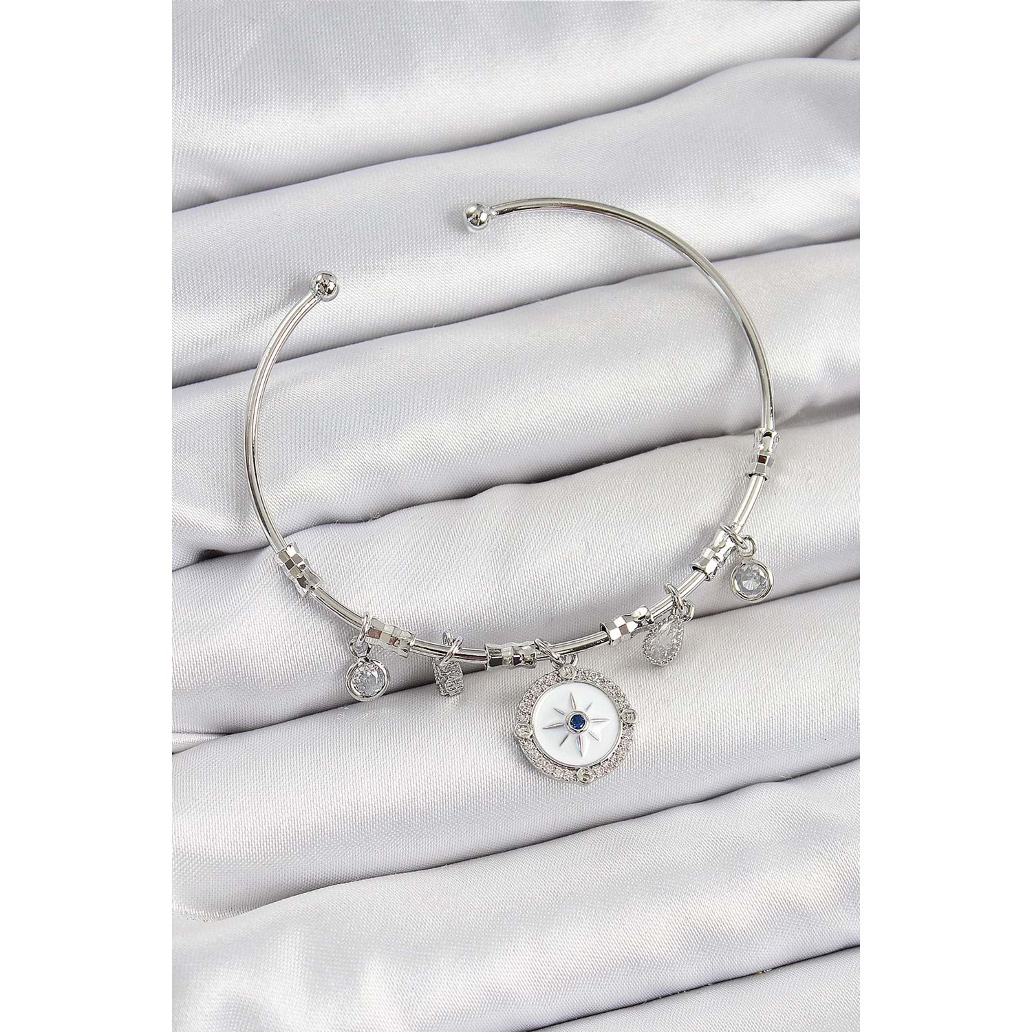 Pirinç Zirkon Taşlı Pusula Model Gümüş Renk Charm Bileklik