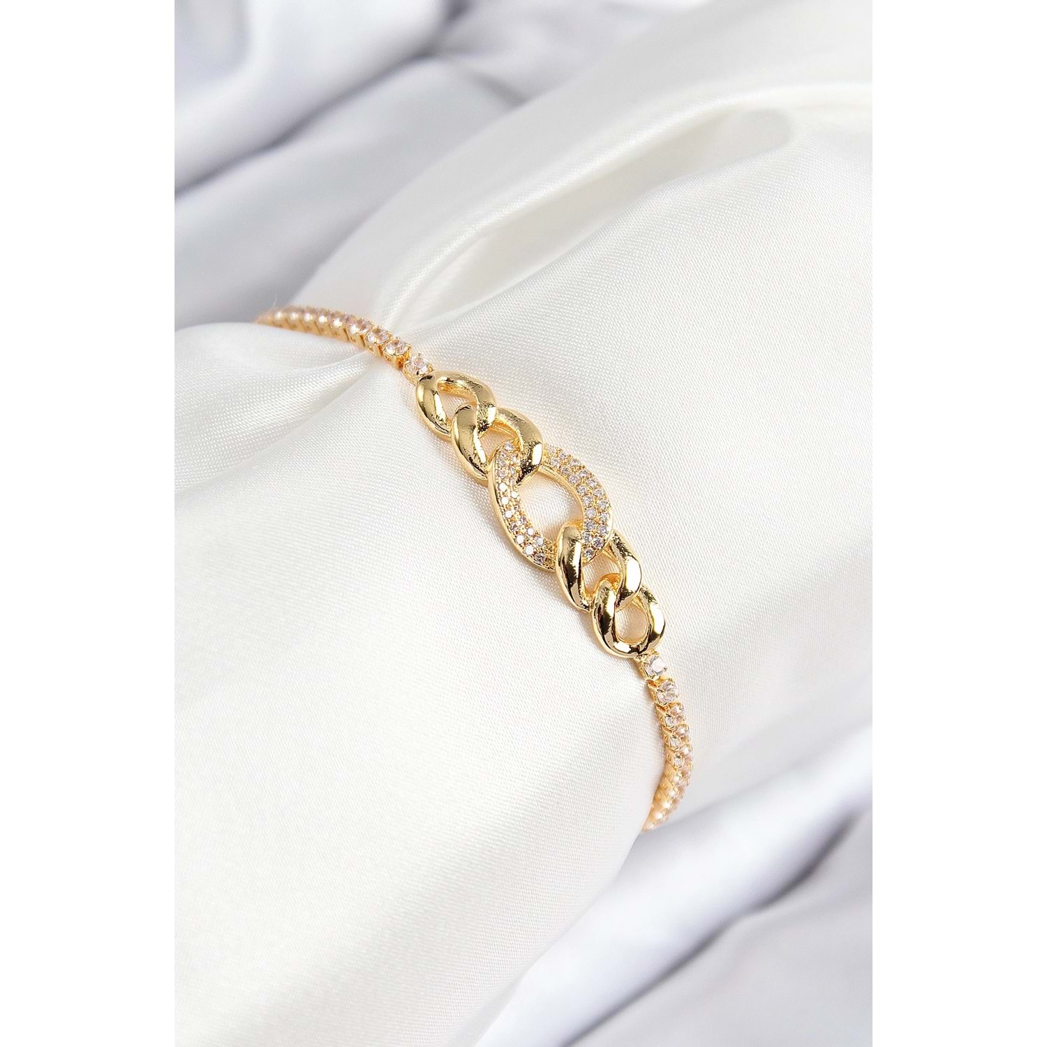 Pirinç Zirkon Taşlı Zincir Model Gold Renk Asansörlü Kadın Bileklik