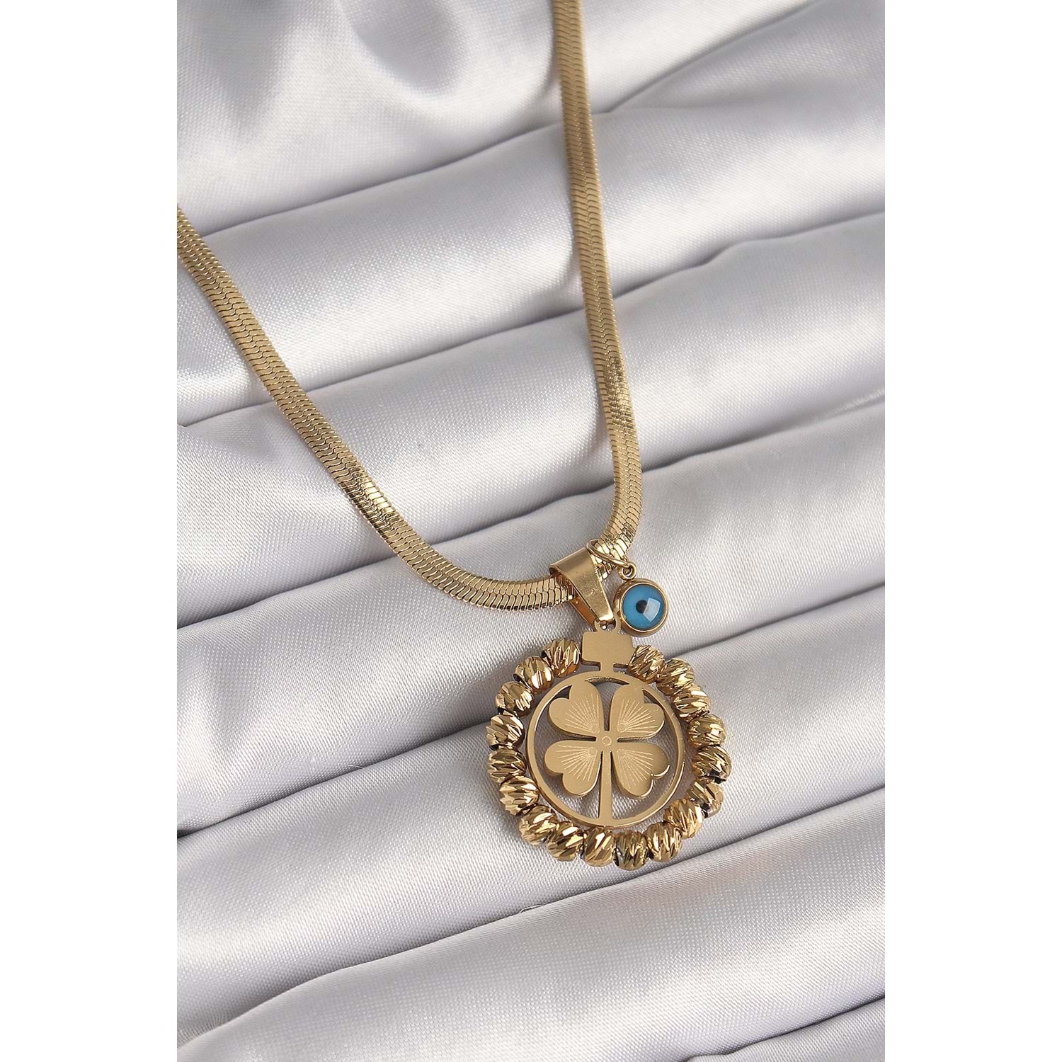 316L Çelik Gold Renk İtalyan Zincir Dorika Yonca Model Nazar Boncuk Detay Kadın Kolye