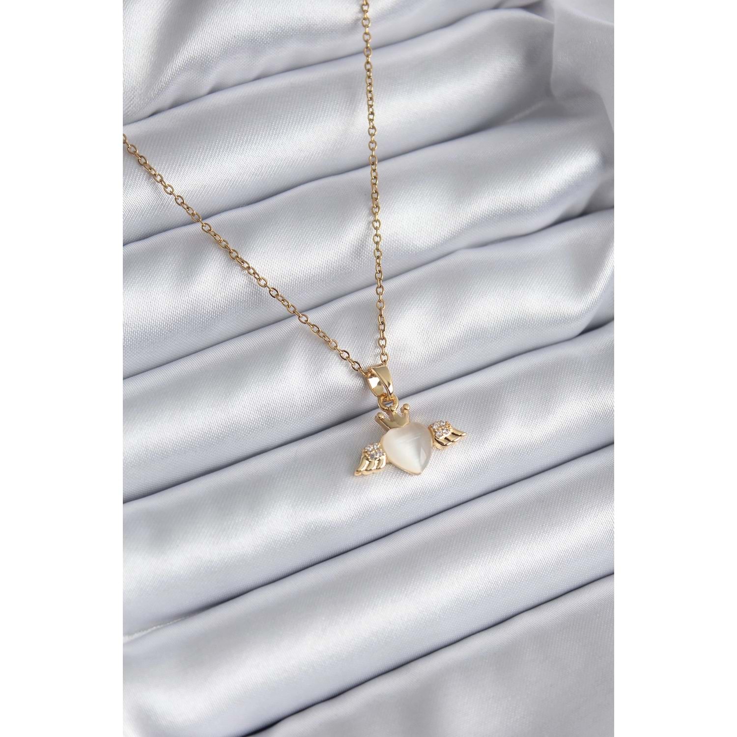316L Çelik Gold Renk Kanatlı Kalp Model Zirkon Taşlı Kadın Kolye