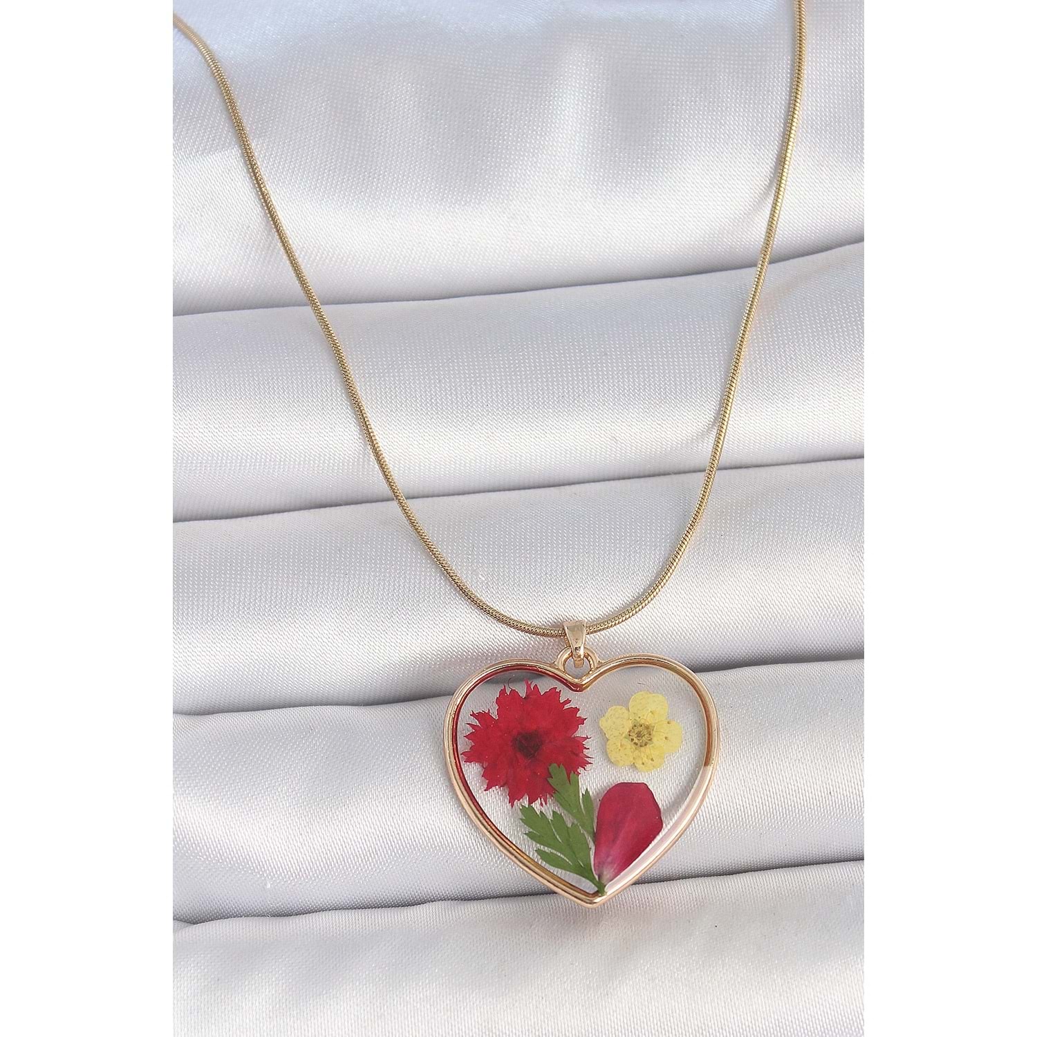 316L Çelik Gold Renk Zincir Epokis Kalp Doğal Çiçek Model Kadın Kolye