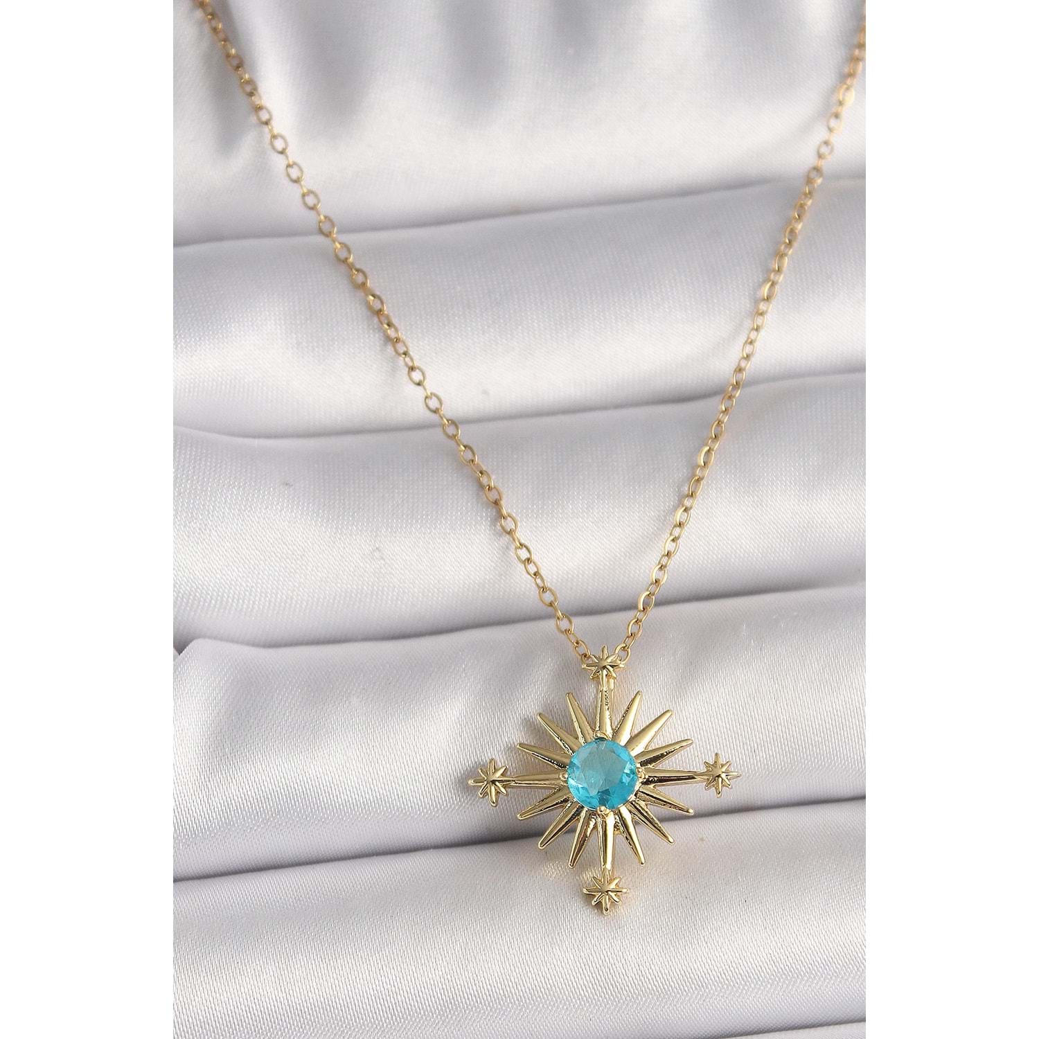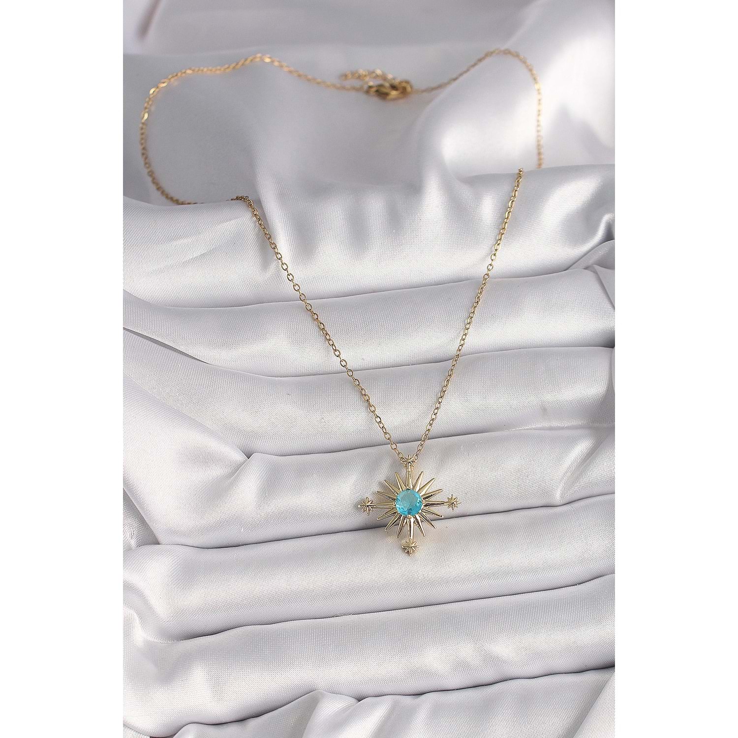 316L Çelik Gold Renk Zincir Mavi Taş Detaylı Kuzey Yıldız Model Kadın Kolye