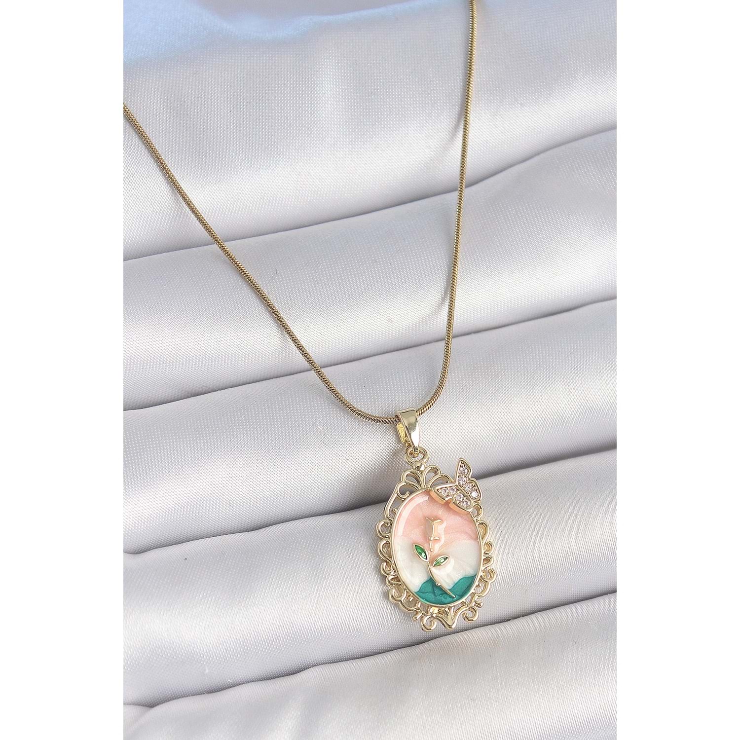 316L Çelik Gold Renk Zincir Mix Renk Çiçek İşlemeli Zirkon Taş Detaylı Portre Model Kadın Kolye