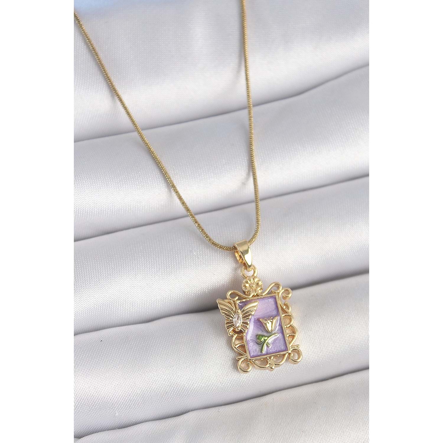 316L Çelik Gold Renk Zincir Mor Mineli Çiçek İşlemeli Zirkon Taşlı Kelebek Detay Portre Model Kadın Kolye