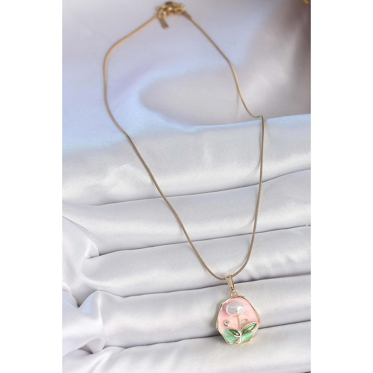 316L Çelik Gold Renk Zincir Pembe Çiçek İşlemeli İnci Detay Portre Model Kadın Kolye