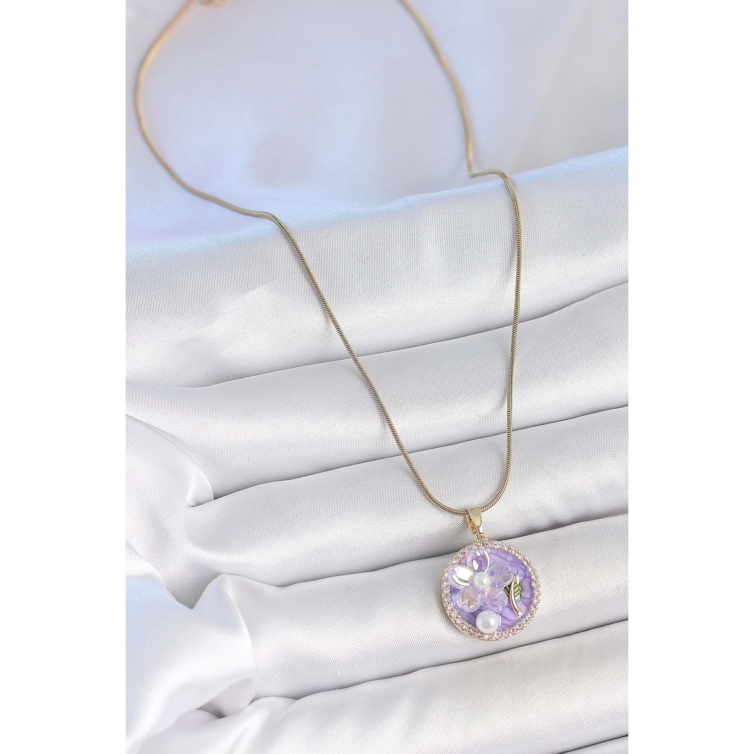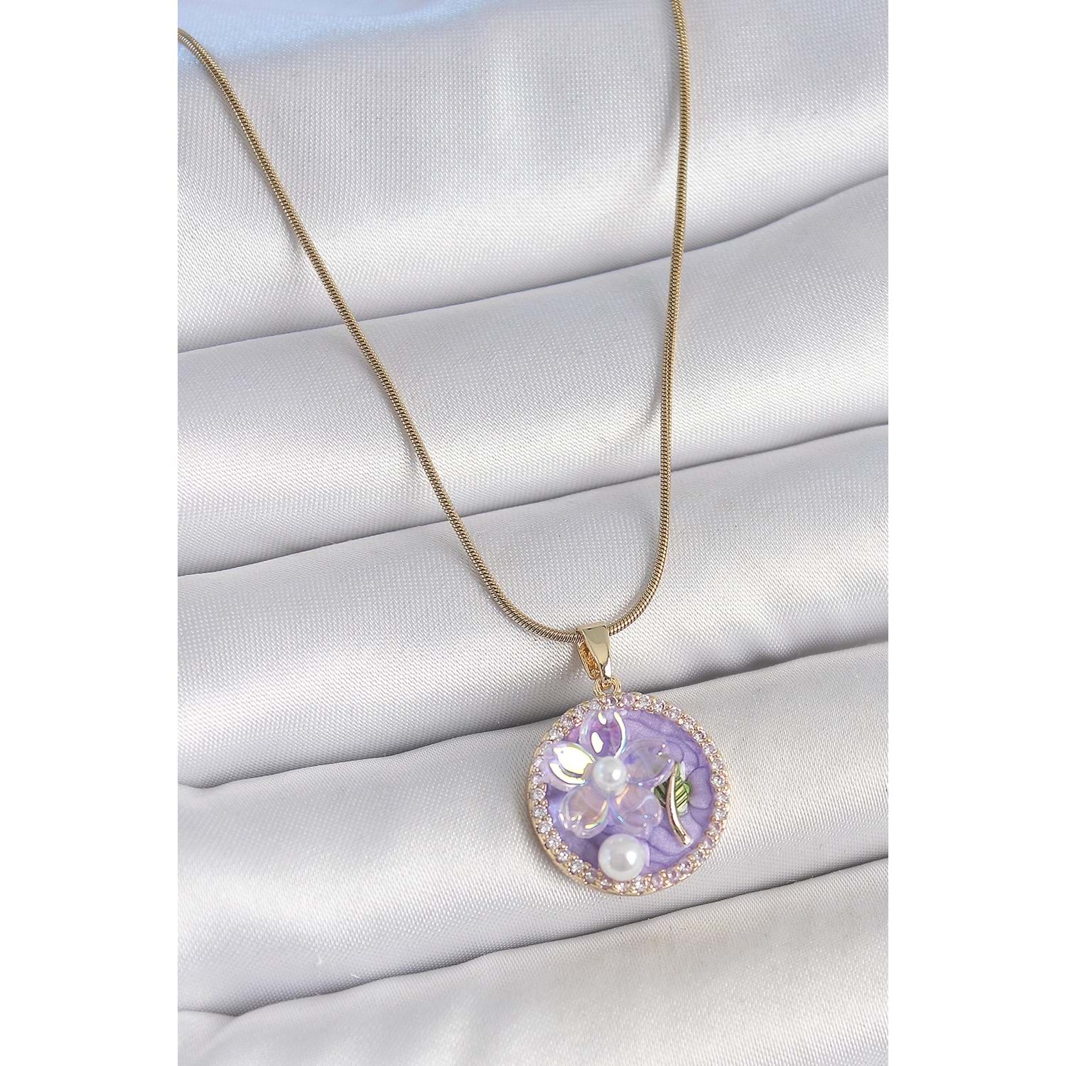316L Çelik Gold Renk Zincir Zirkon Taşlı Mor Mineli Çiçek İşlemeli İnci Detay Portre Model Kadın Kolye