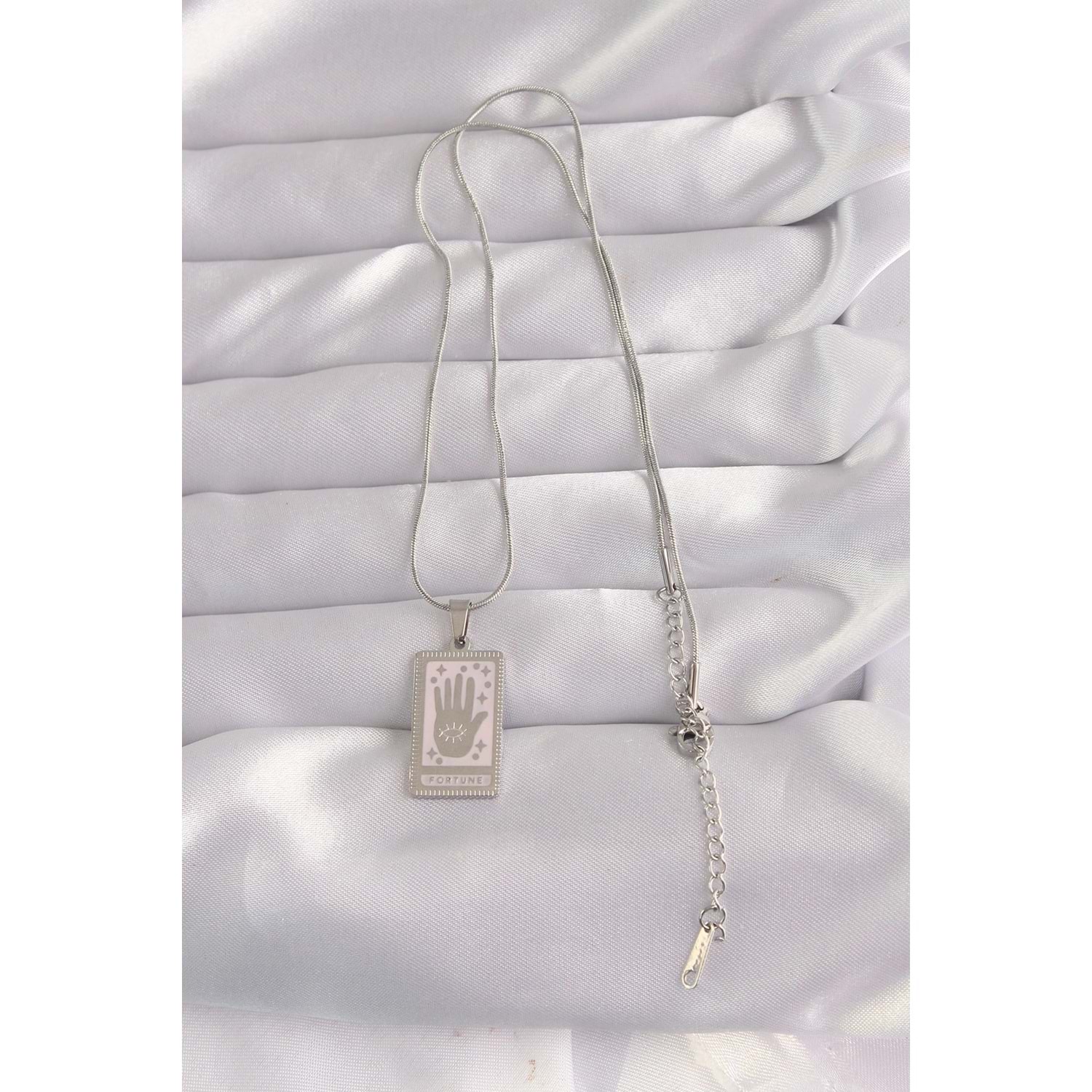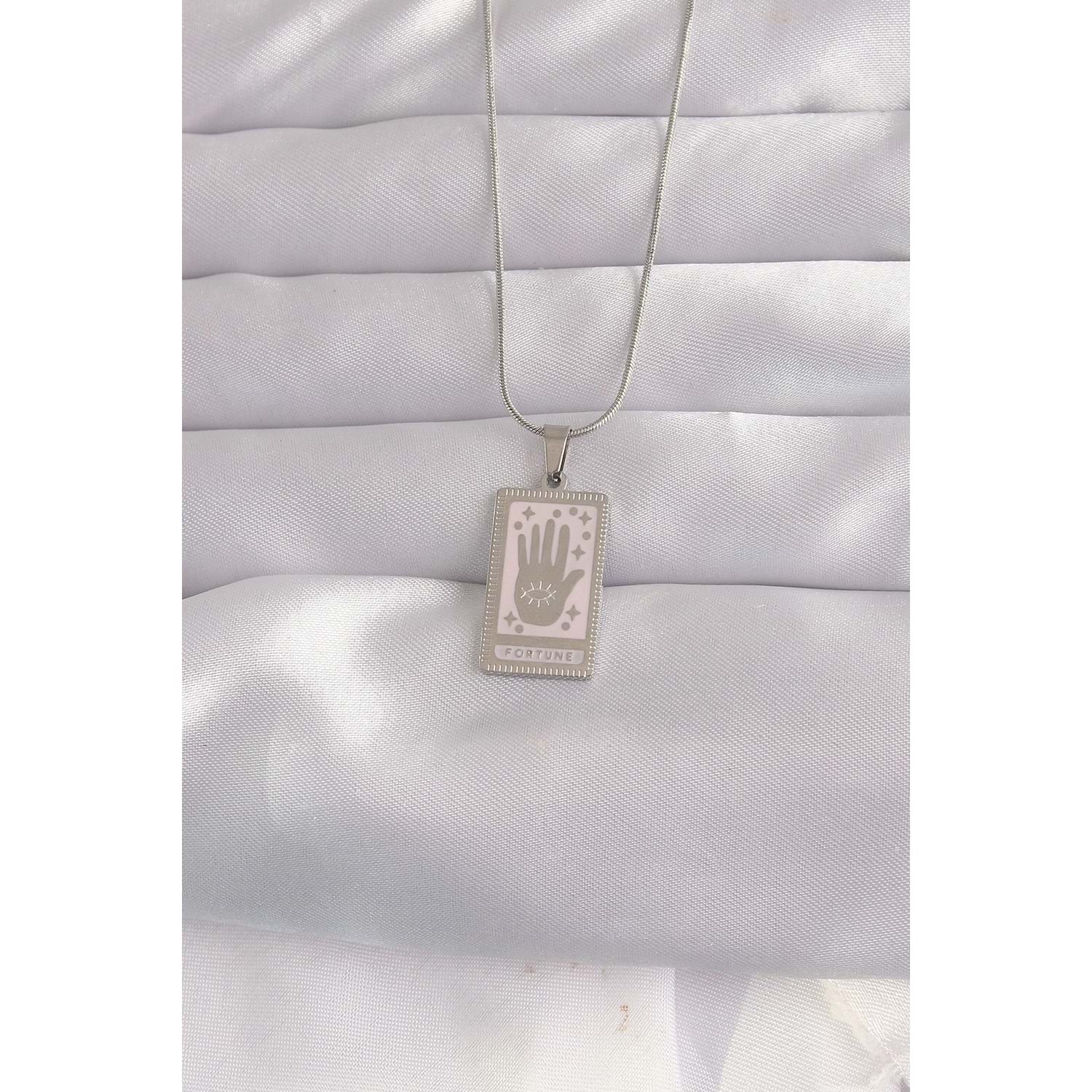 316L Çelik Gümüş Renk Pembe Mineli El Figür Tarot Kolye