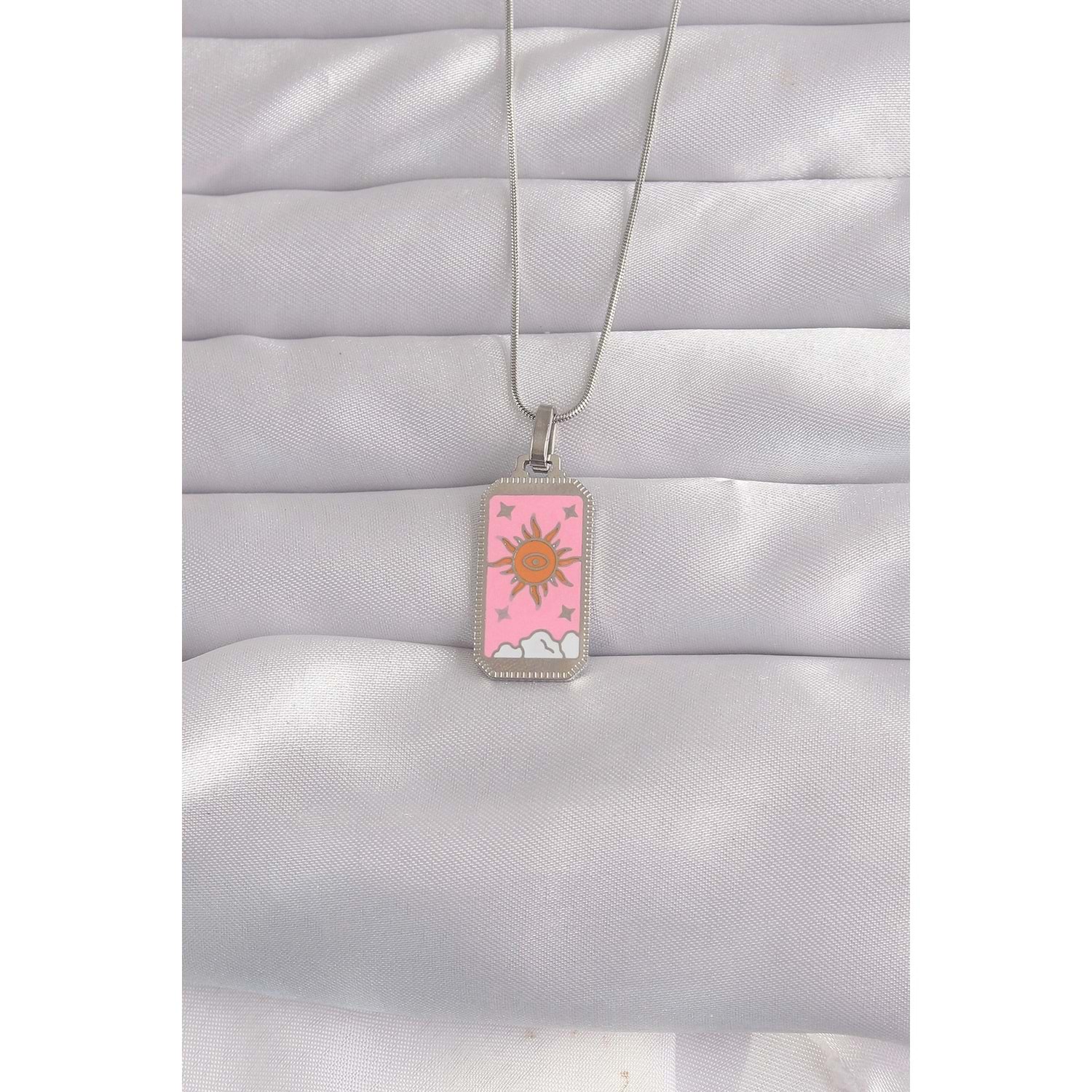 316L Çelik Gümüş Renk Pembe Mineli Güneş Model Tarot Kolye
