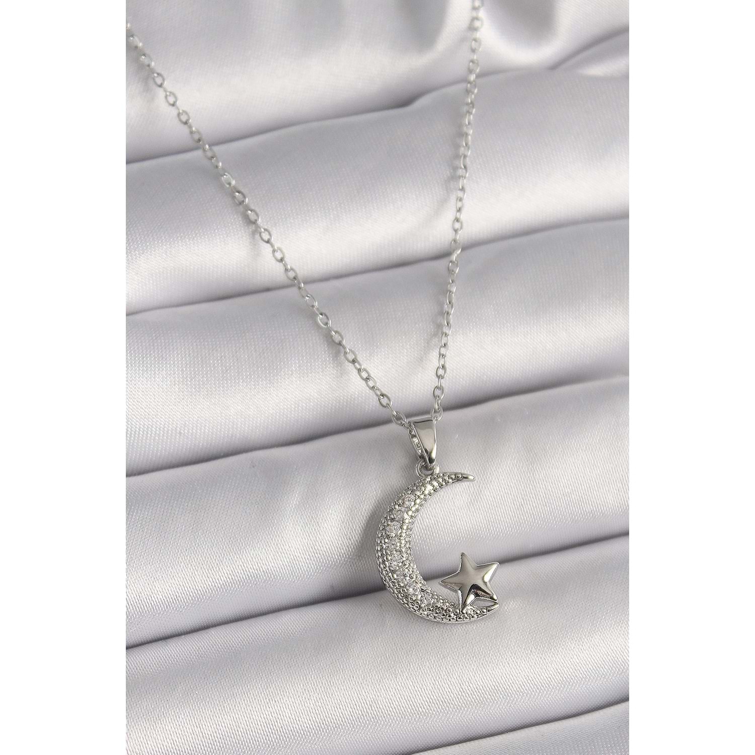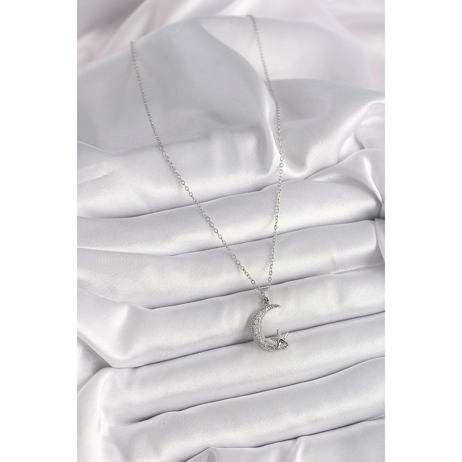 316L Çelik Gümüş Renk Zincir Zirkon Taşlı Hilal Model Yıldız Detay Kadın Kolye