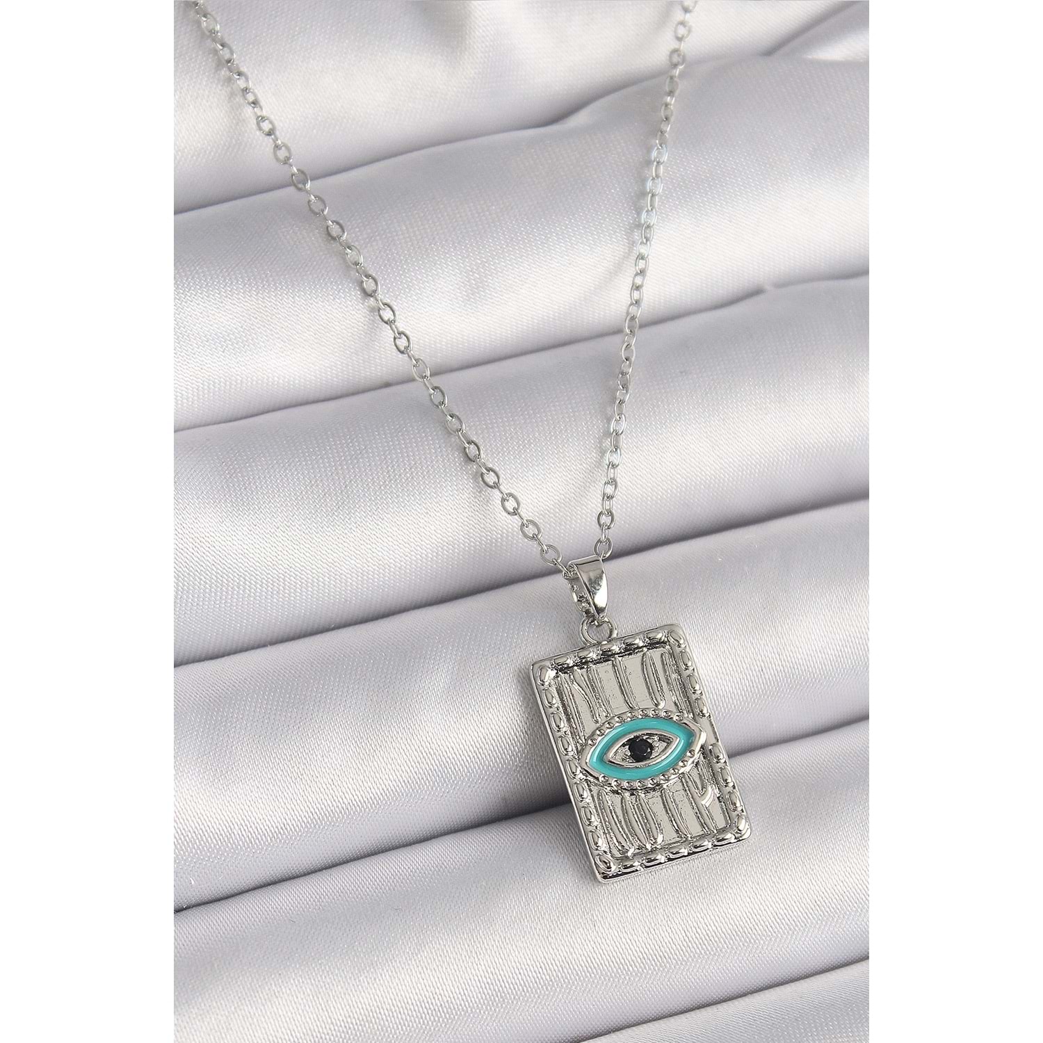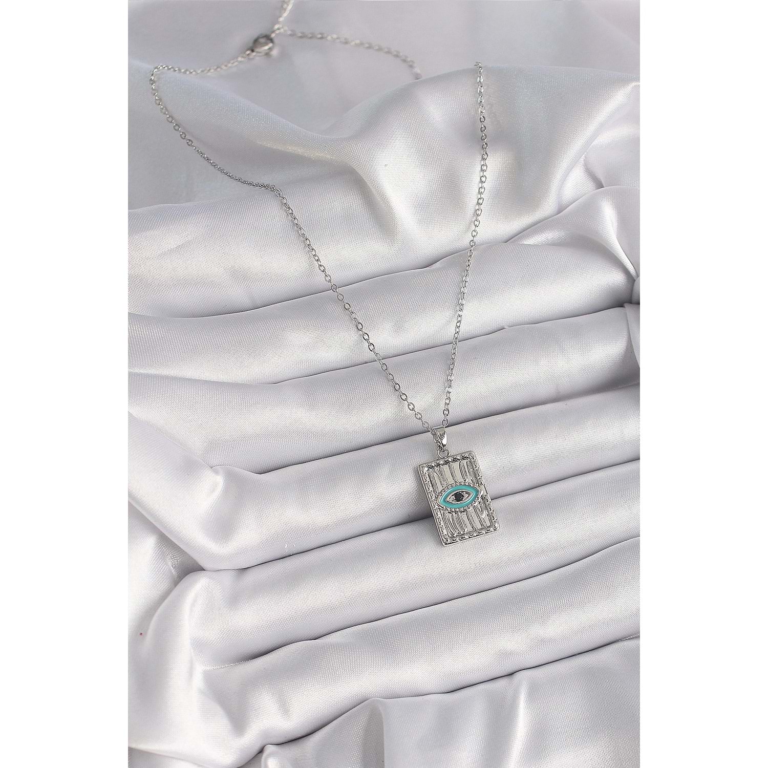316L Çelik Gümüş Renk Zirkon Taşlı Göz İşleme Detaylı Plaka Model Kadın Kolye
