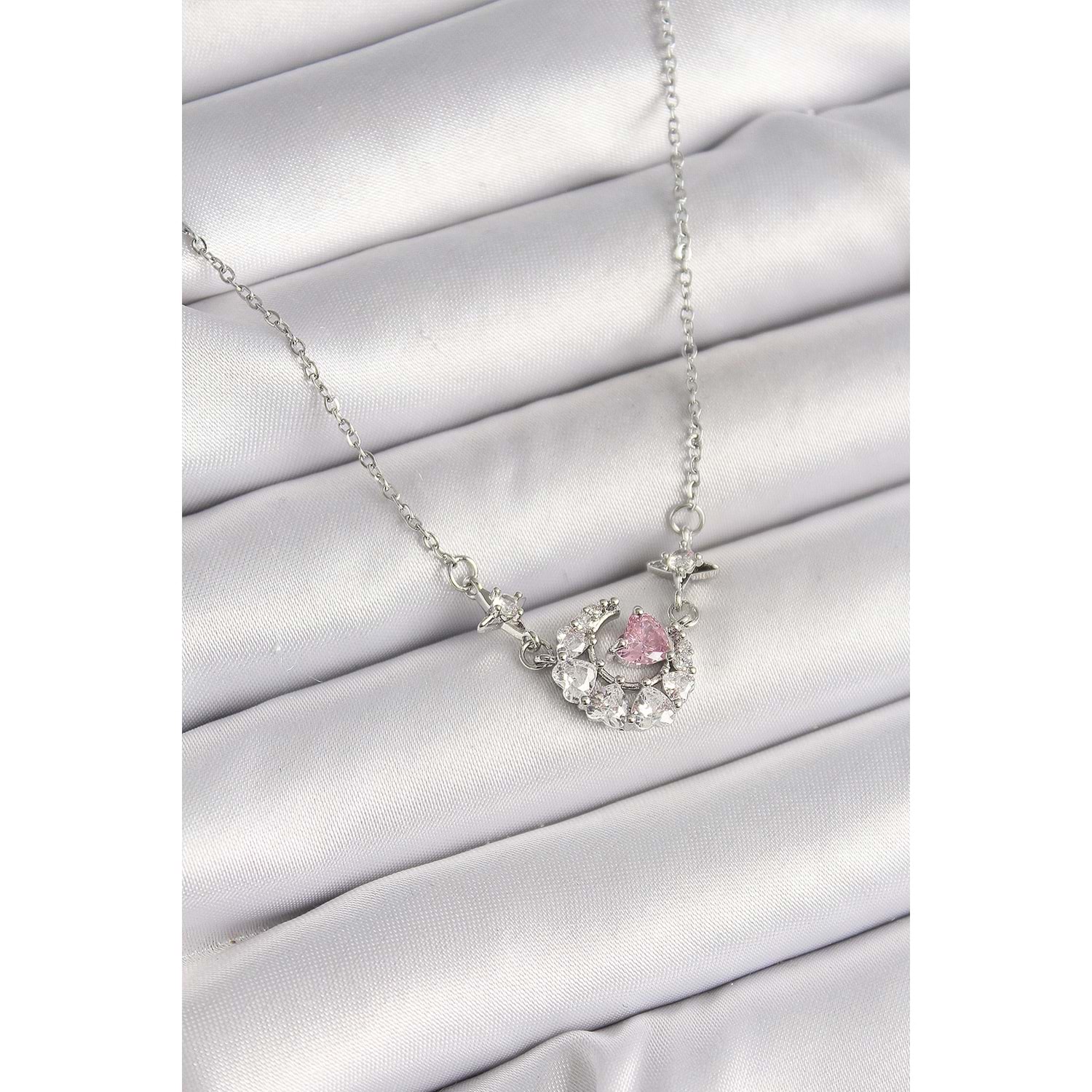 316L Çelik Gümüş Renk Zirkon Taşlı Hilal Pembe Kalp Model Kadın Kolye