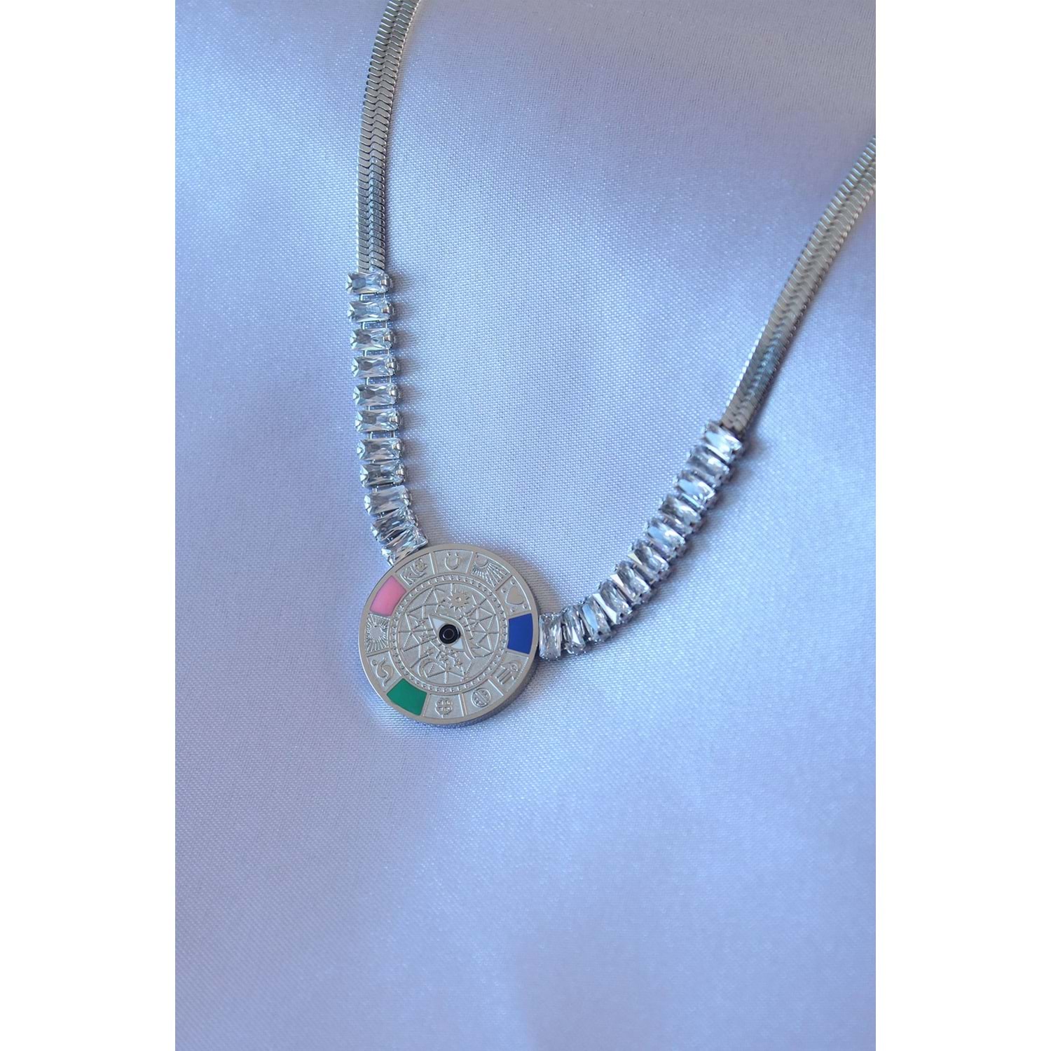 316L Çelik Gümüş Renk Zirkon Taşlı İtalyan Zincir Burç İşeleme Madalyon Model Kadın Kolye