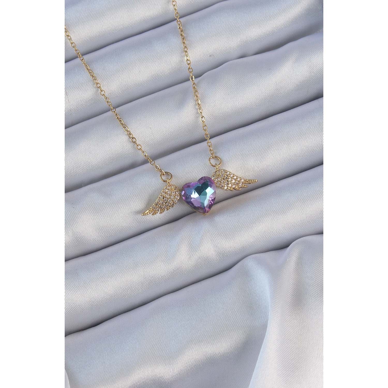 316L Çelik Zincir Altın Renk Mavi Mor Zirkon Taşlı Kanatlı Kalp Kolye