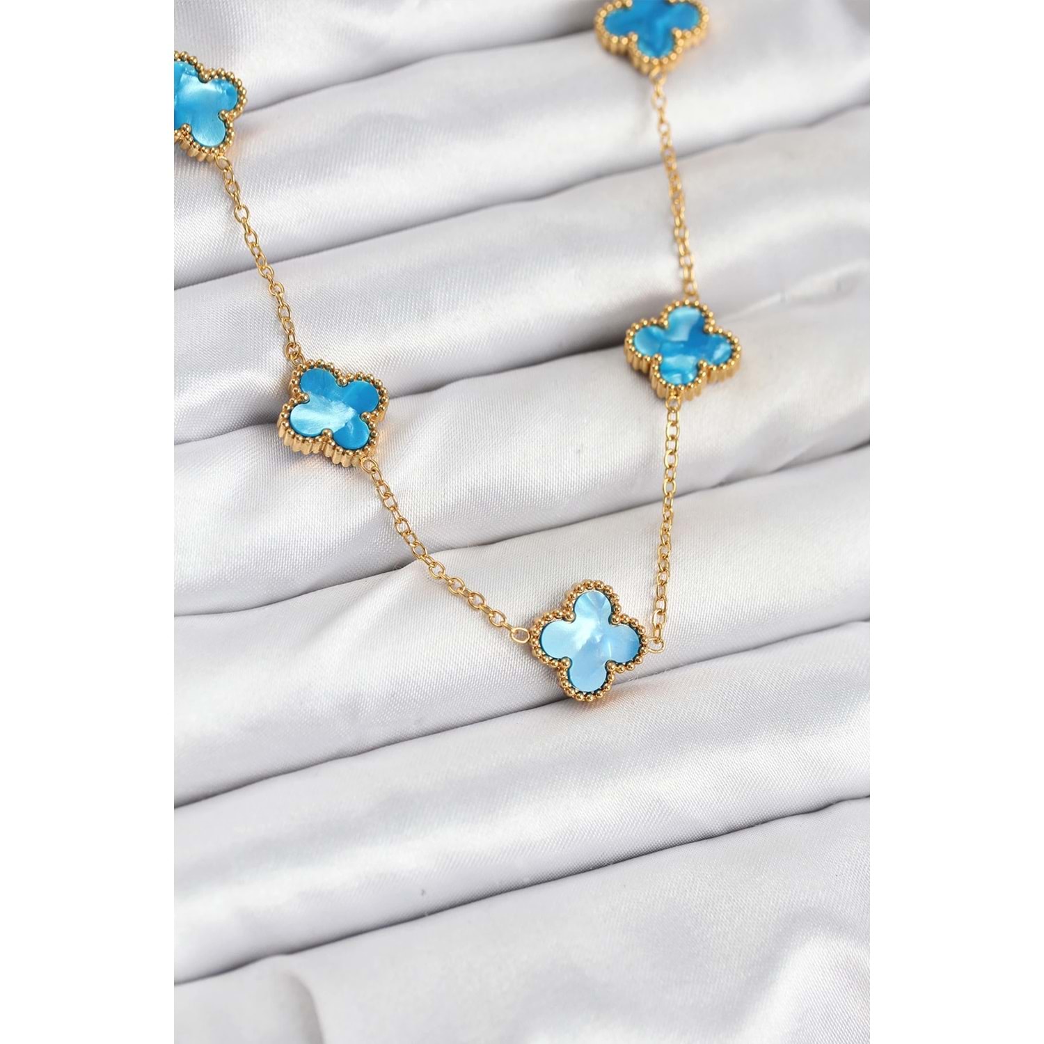316L Çelik Zincir Gold Buz Mavisi Renk Yonca Kolye