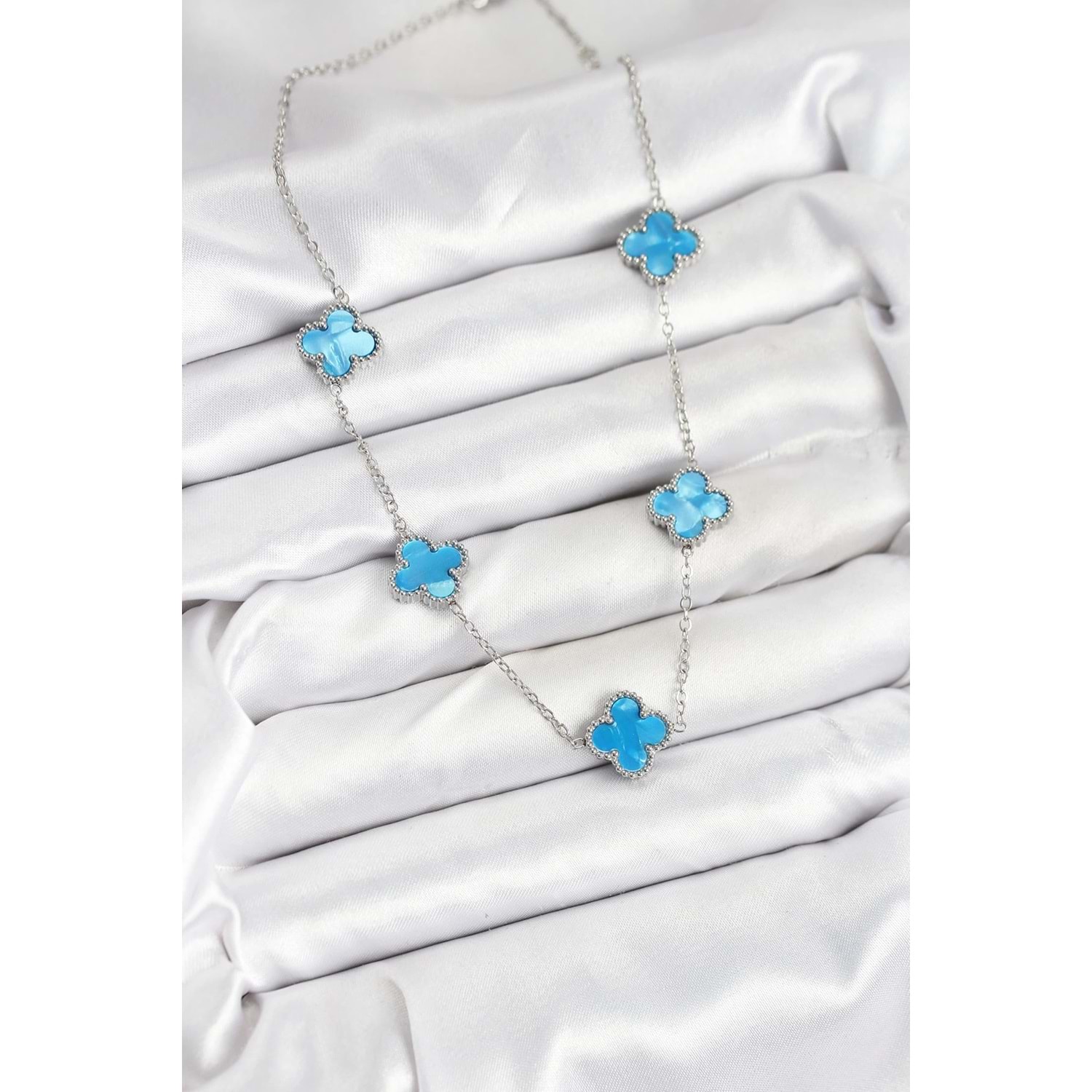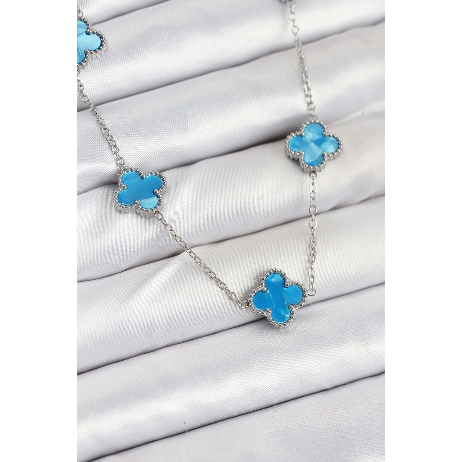 316L Çelik Zincir Gümüş Buz Mavisi Renk Yonca Kadın Kolye