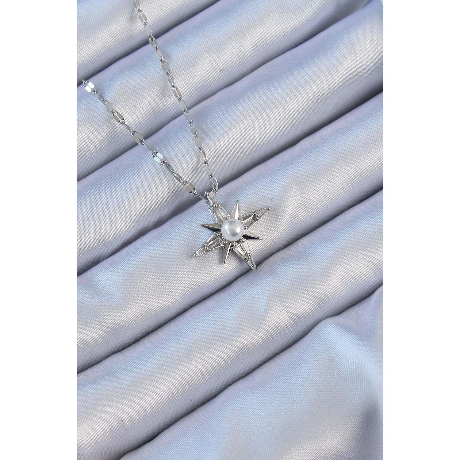316L Çelik Zincir Gümüş Renk Baget Taşlı İnci Detay Kutup Yıldızı Kolye