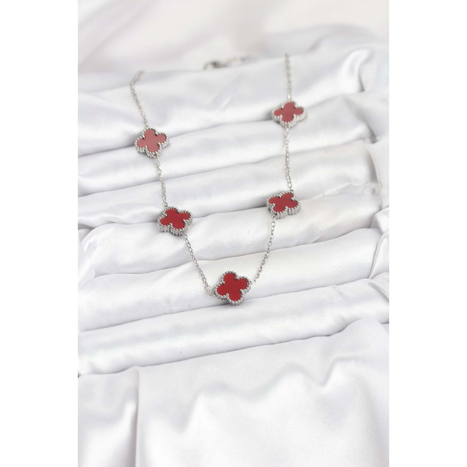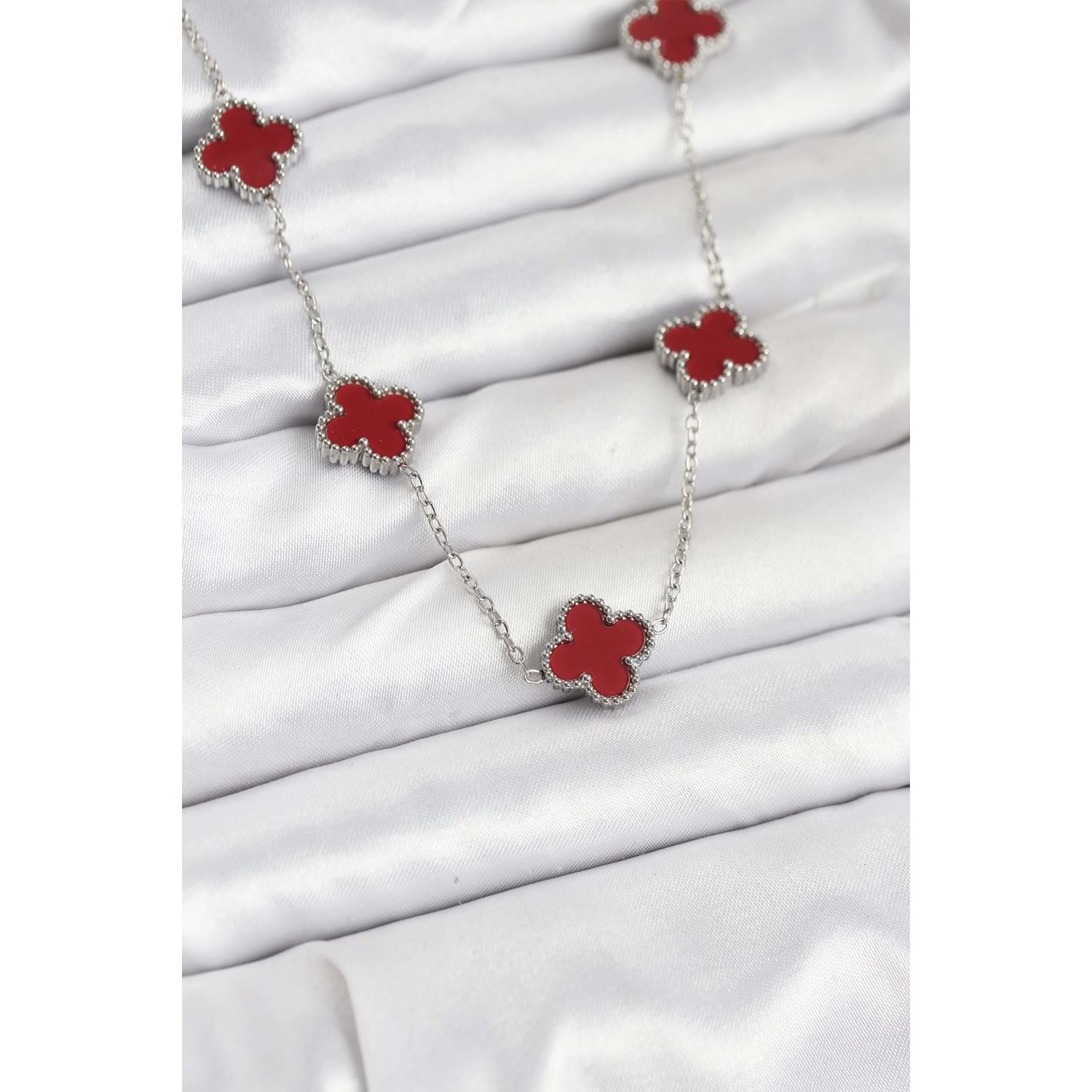316L Çelik Zincir Gümüş Renk Bordo Renk Yonca Kadın Kolye