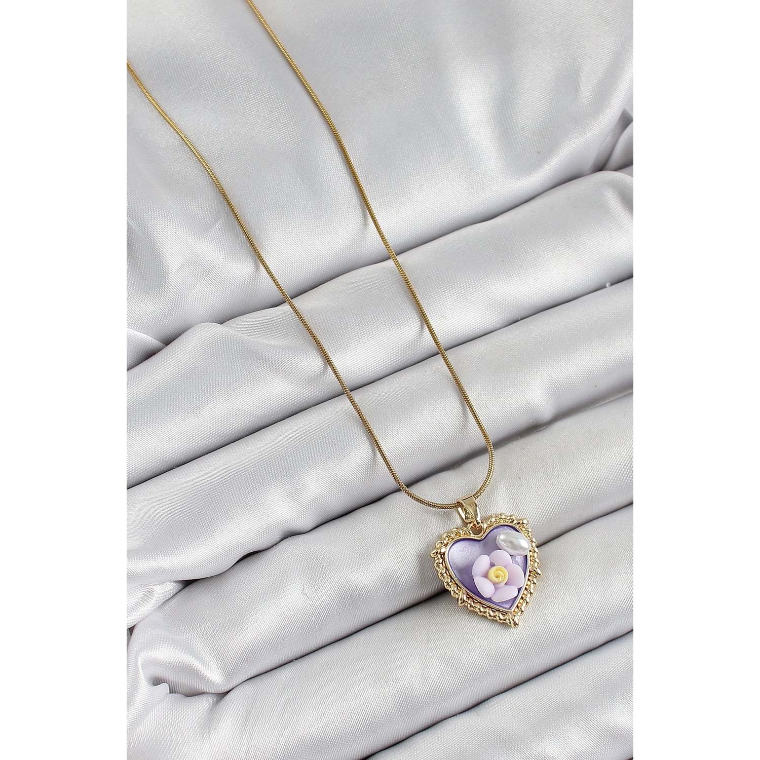 316L Çelik Zincir Mor Sanatsal Portre İnci Detaylı Papatya Figürlü Kalp Model Gold Renk Kadın Kolye