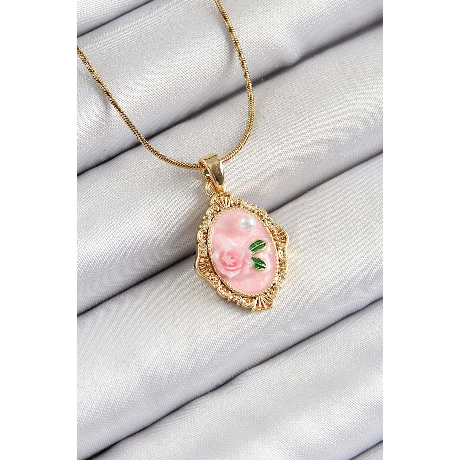 316L Çelik Zincir Pembe Sanatsal Portre İnci Detaylı Gül Figürlü Model Gold Renk Kadın Kolye