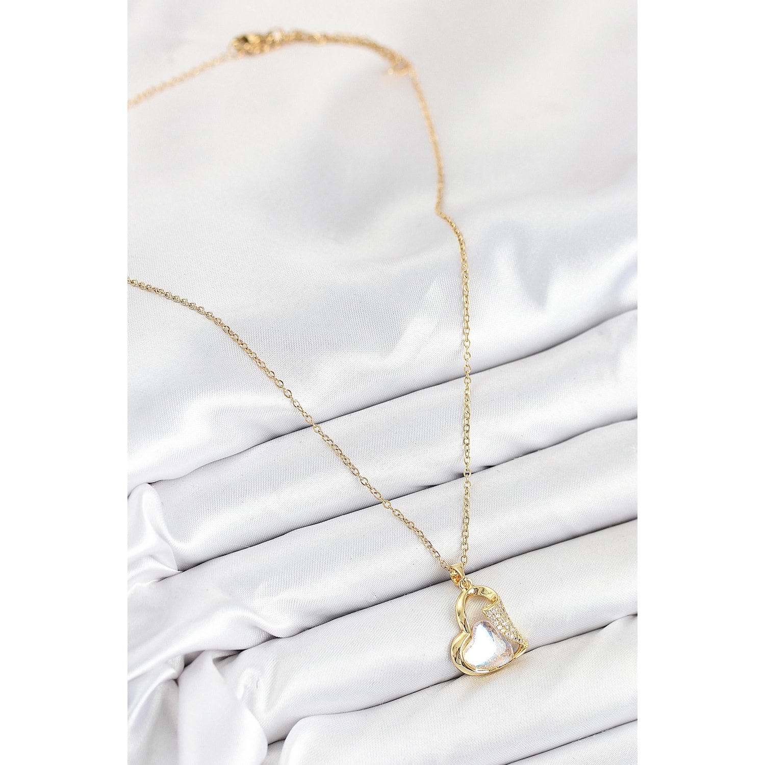 316L Çelik Zirkon Taşlı Kalp Model Gold Renk Kadın Kolye