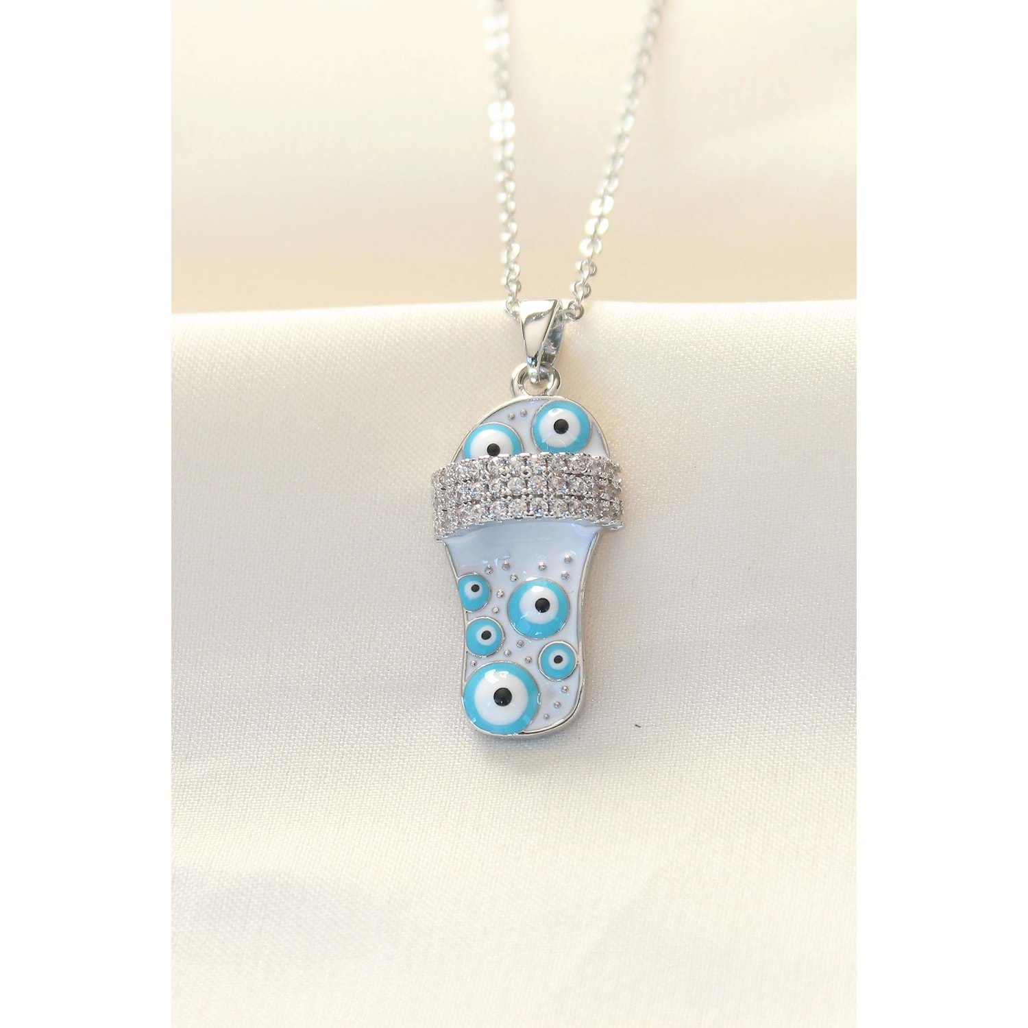 316L Zinciri Çelik Zirkon Taşlı Gümüş Renk Nazar Boncuklu Terlik Kolye