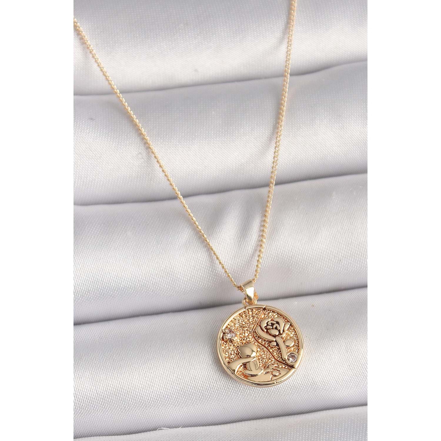 Pirinç Gold Renk Zirkon Taş Detaylı Gül İşleme Madalyon Model Kadın Kolye
