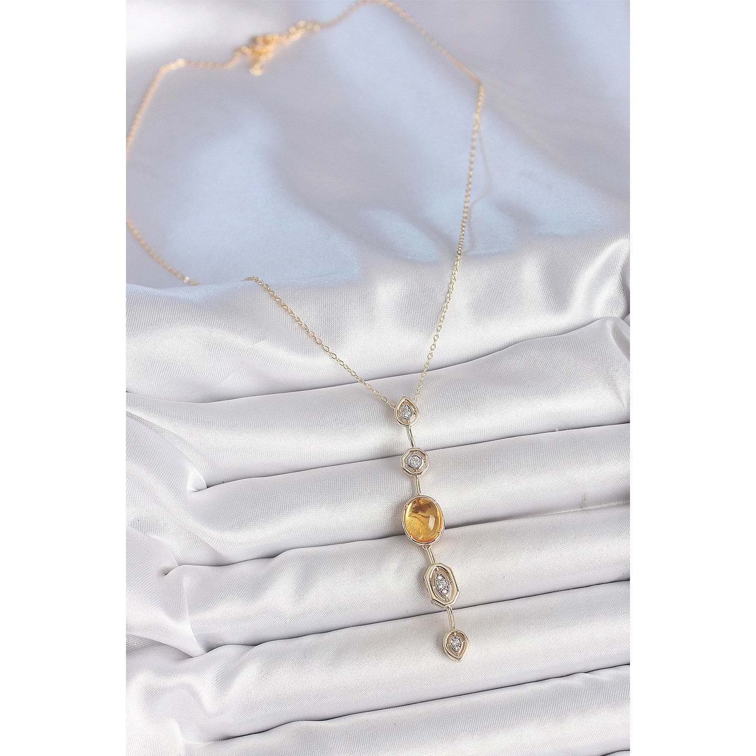 Pirinç Zincir Kehribar Sarı Gold Renk Zirkon Taşlı Y Kolye