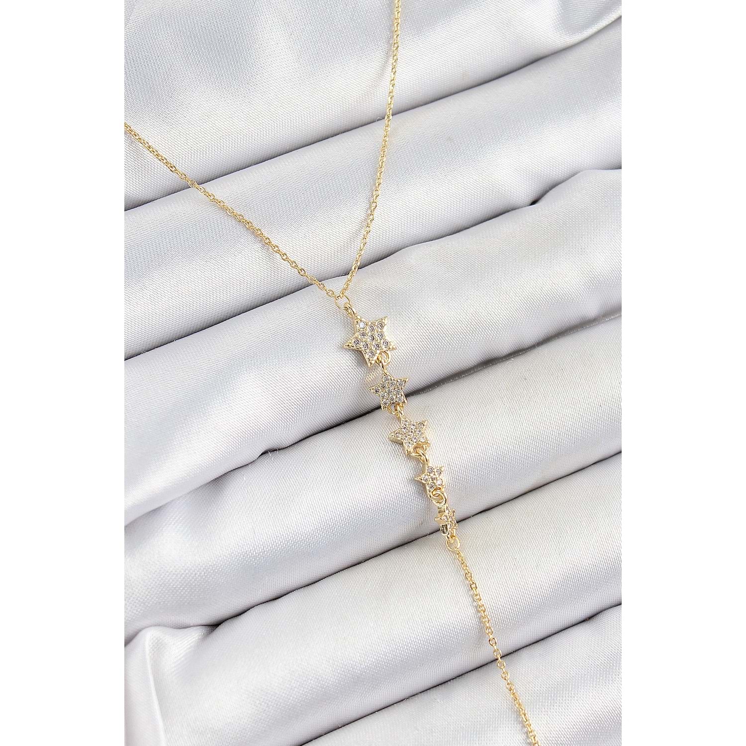 Pirinç Zirkon Taşlı Sıralı Yıldız Figürlü Y Model Gold Renk Kadın Kolye