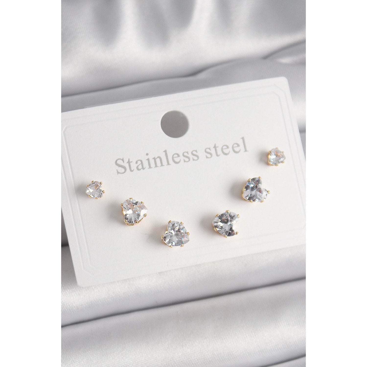 316L Çelik Gold Renk Zirkon Taşlı Kalp Model Kadın Küpe Seti