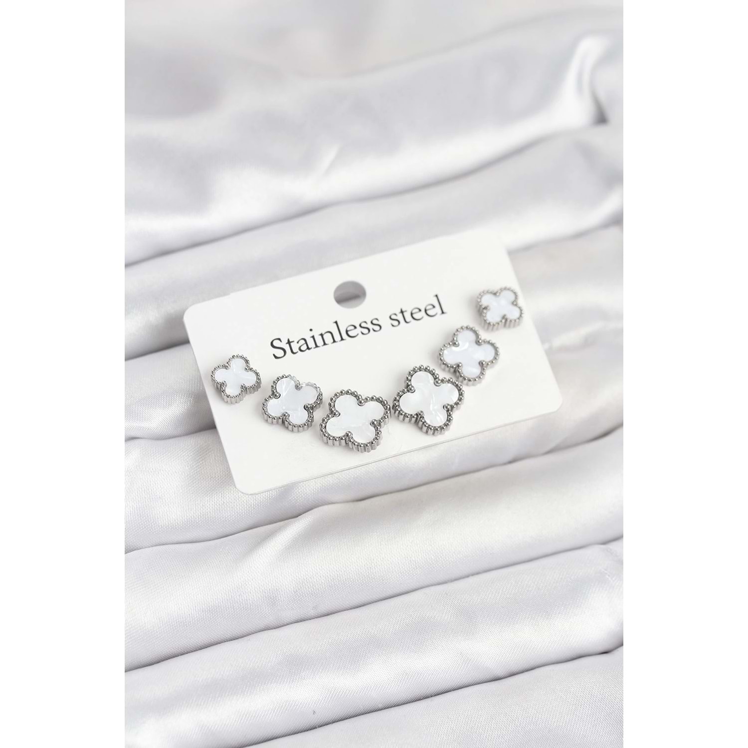 316L Çelik Gümüş Beyaz Renk 3 Boy Yonca Küpe Seti