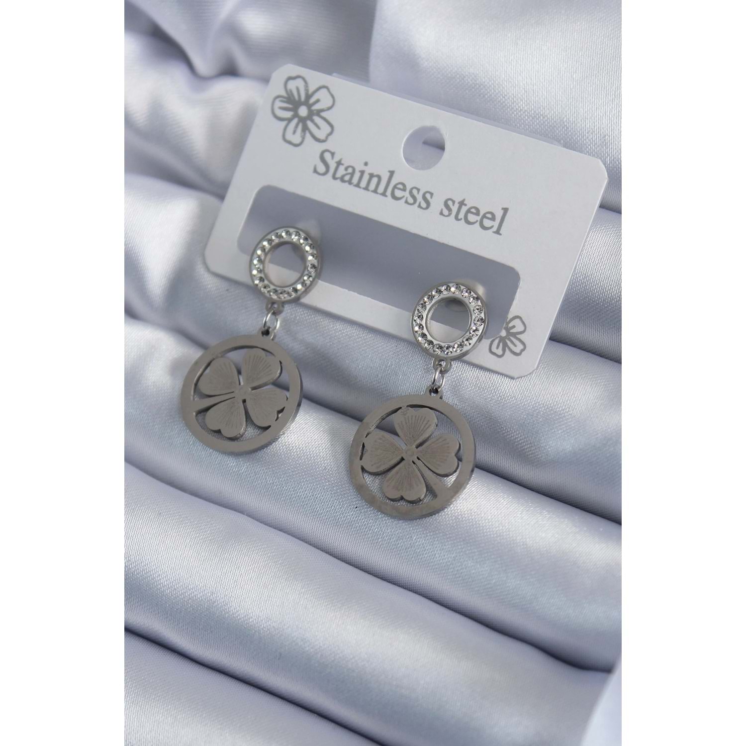 316L Çelik Gümüş Renk Zirkon Taşlı Yonca Model İşleme Detay Kadın Küpe