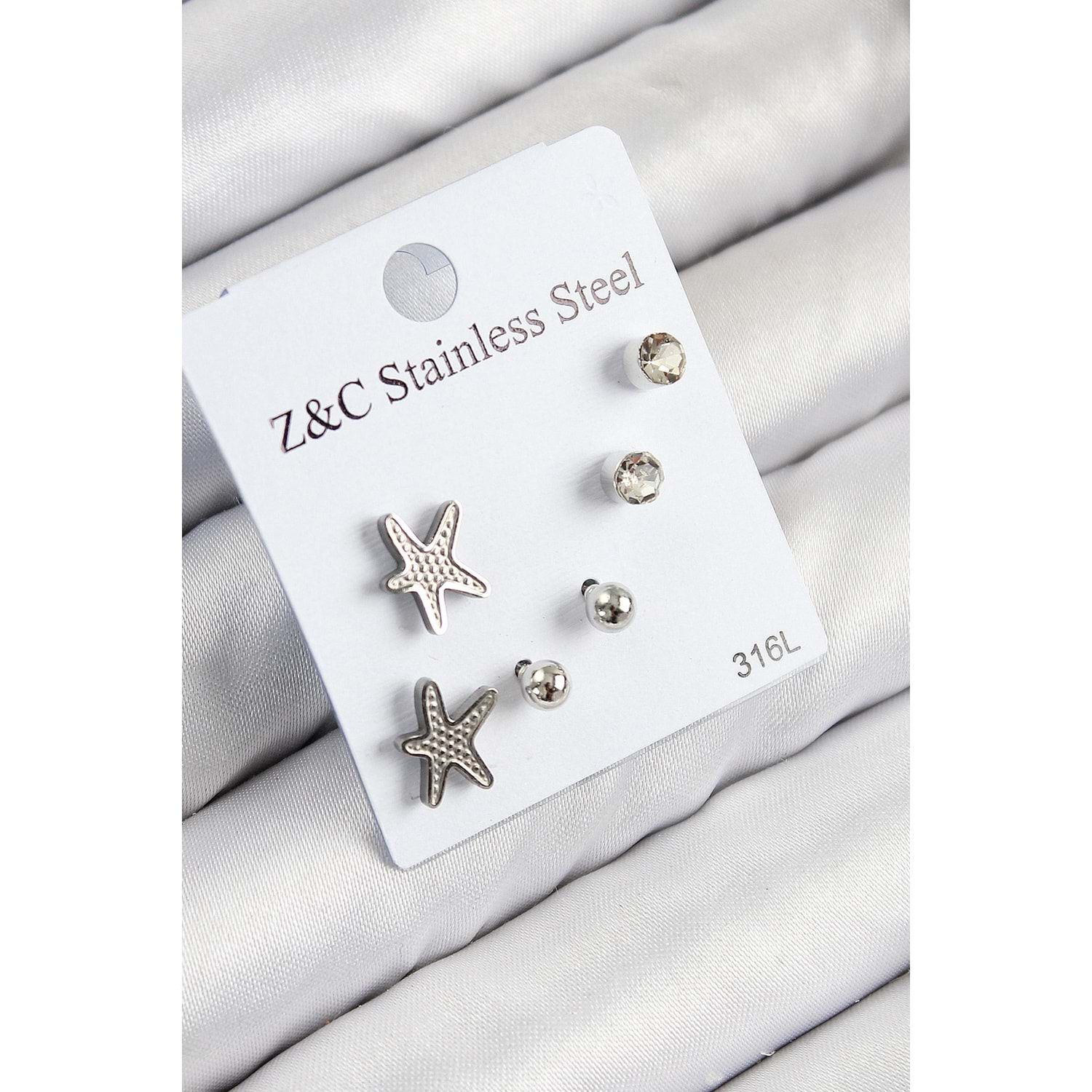 316L Çelik Zirkon Taşlı Deniz Yıldızı Model Gümüş Renk Kadın Set Küpe