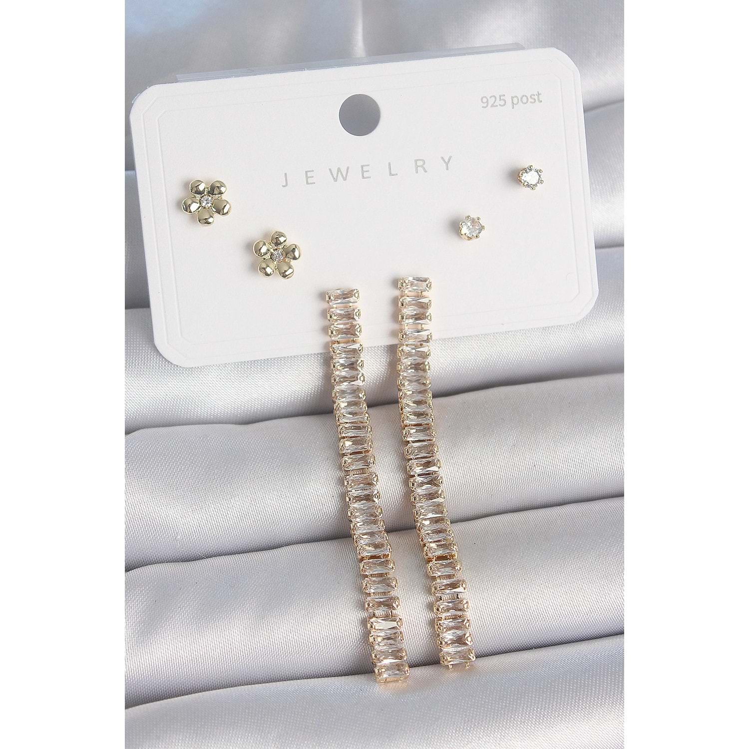 Pirinç Gold Renk Su Yolu Zirkon Taşlı Sallantı Model Çiçek Detay 925 Ayar Gümüş Çivi Kadın Küpe Seti