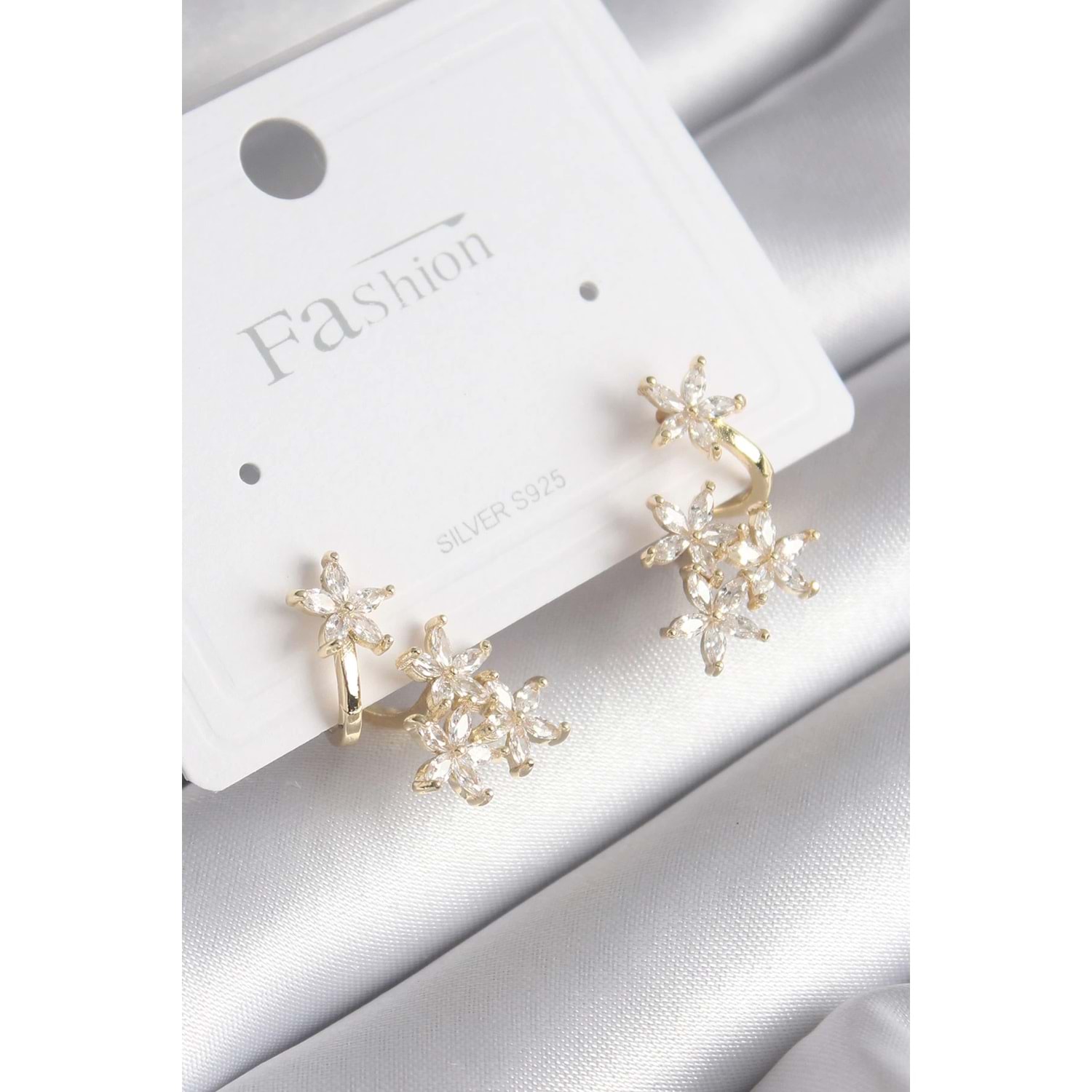 Pirinç Gold Renk Zirkon Taşlı Çiçek Tasarım Kadın Küpe