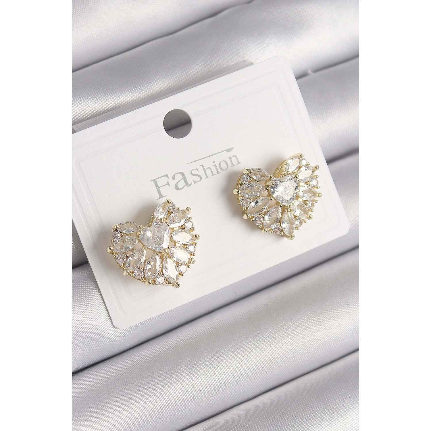 Pirinç Gold Renk Zirkon Taşlı Kalp Model Kadın Küpe
