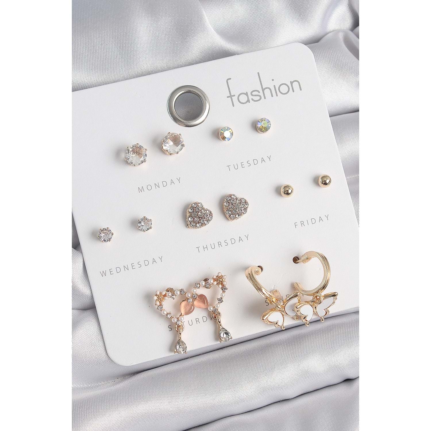 Pirinç Gold Renk Zirkon Taşlı Sallantılı Kalp Figür Kelebek Detay 7 Çift Kadın Küpe Seti