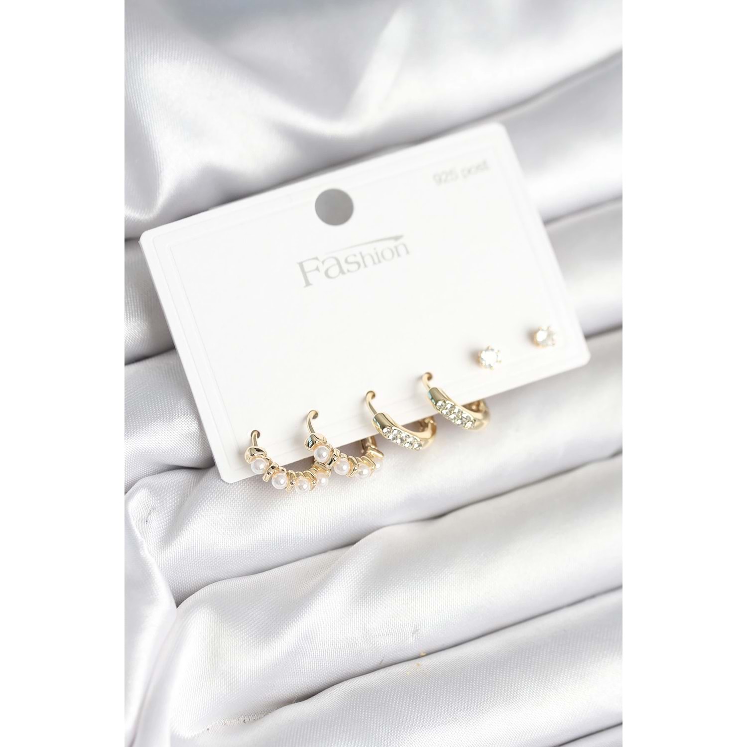 Pirinç Gold Renk Zirkon Taşlı ve İncili Model 925 Ayar Gümüş Çivi Kadın Küpe Seti